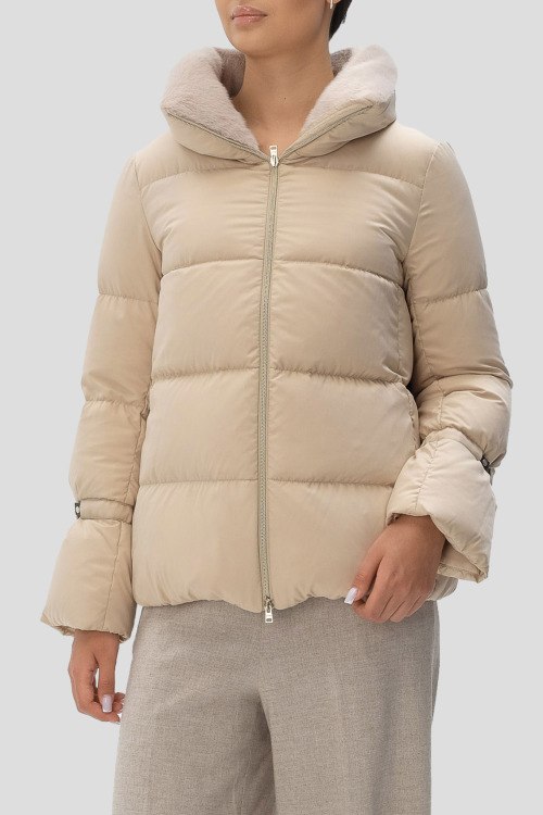 Детали: Женская бежевая утепленная куртка от Herno (Эрно). Стеганый дизайн, высокий меховой воротник, боковые карманы, застежка-молния, классическая длина, синтетический утеплитель