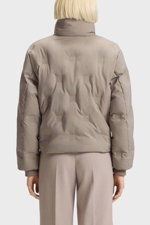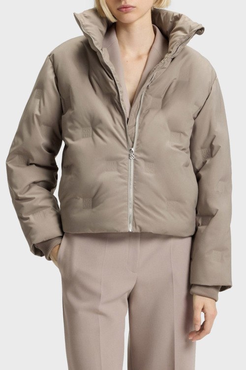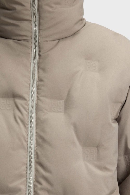 Детали: Женская бежевая утепленная куртка Farinella от Hugo by Hugo Boss (Хуго бай Хуго Босс). Тиснение логотипа по всей поверхности, высокий воротник, боковые карманы, застежка-молния, классическая длина