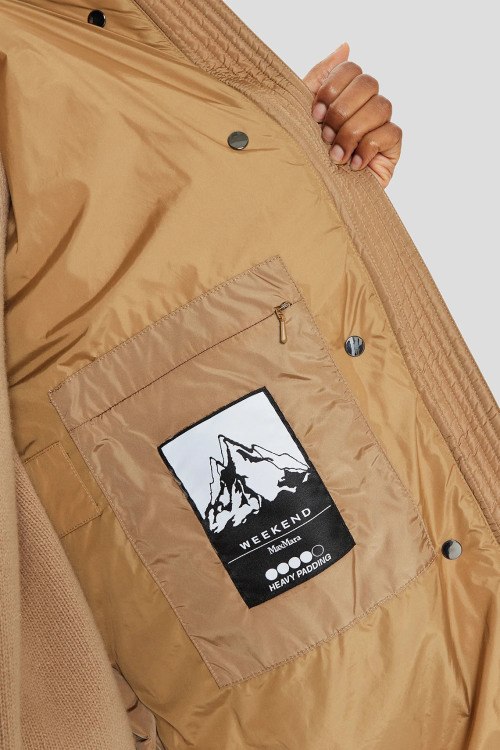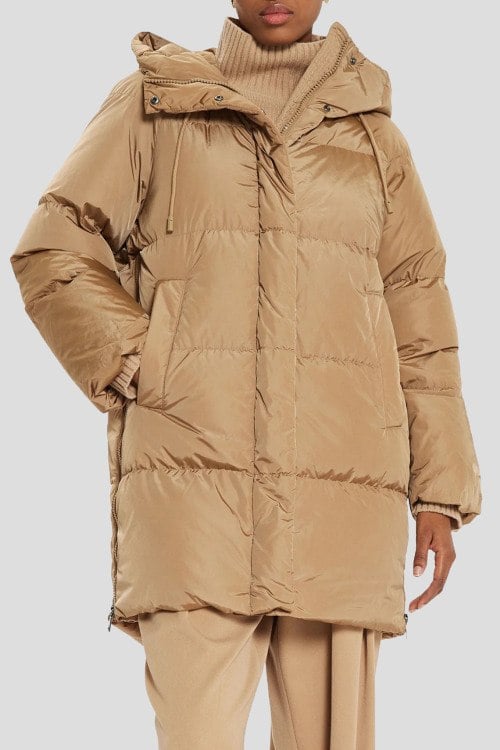 Детали: Женская бежевая куртка на пуху с капюшоном Newbembo от Max Mara (Макс Мара). Стеганый дизайн, вшитый капюшон, застежка на молнию и кнопки, застежки-молнии по бокам, боковые карманы, пуховый наполнитель, удлиненная длина