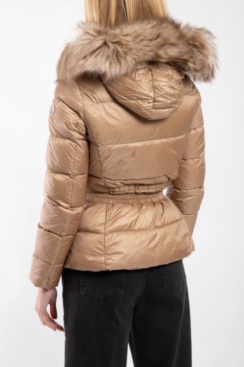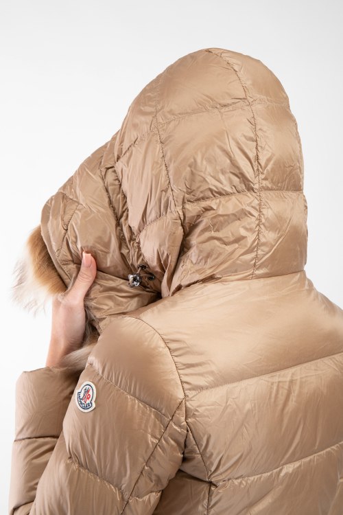 Детали: Женская бежевая куртка из полиамида от Moncler (Монклер). Вшитый капюшон с меховым отворотом, застежка на молнию, стеганый дизайн, эластичный пояс в тон изделия, прорезные карманы, модель утепленная миксом из пуха и пера, патч-лого