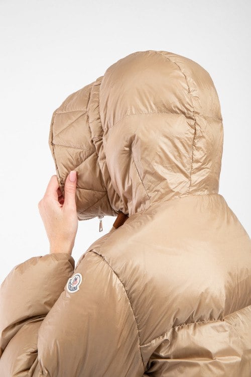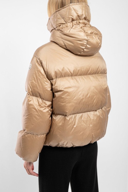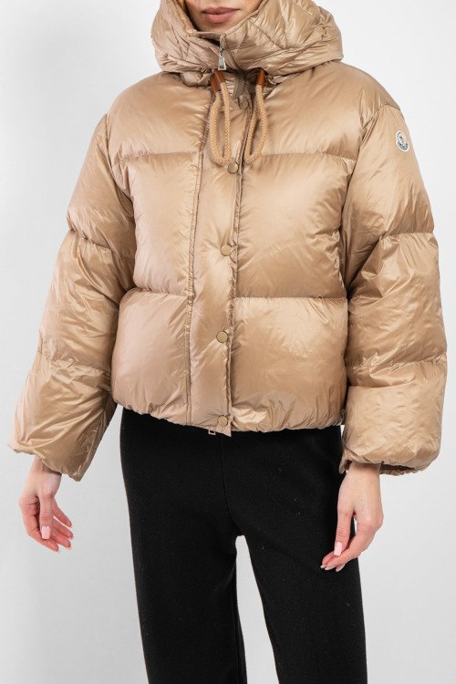 Женская бежевая куртка на пуху Borey от Moncler (Монклер). Стеганый дизайн, вшитый капюшон, высокий воротник, нашивка с логотипом на рукаве, рукава с застежкой на кнопках на внутренней стороне, боковые карманы, застежка на молнию и кнопки, короткая длина, наполнитель из микса пуха и пера.
