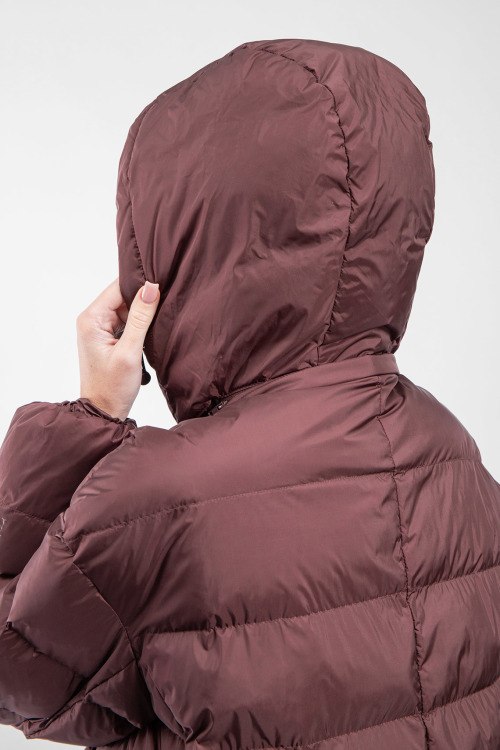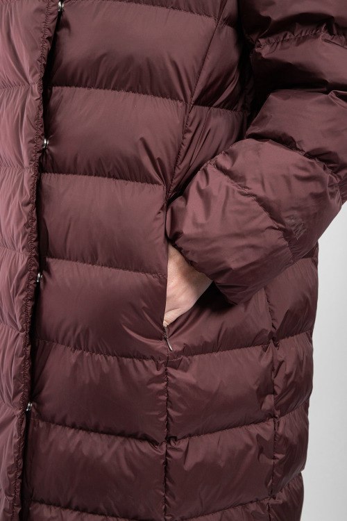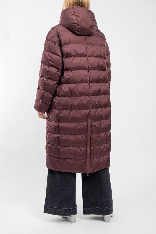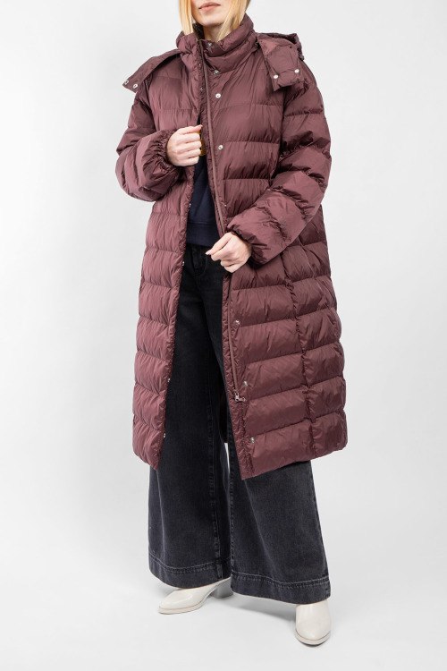 Женская бордовая зимняя куртка Carioca от Max Mara Weekend (Макс Мара Викенд). Стеганый дизайн, высокий воротник, съемный капюшон, боковые карманы, застежка на молнию и кнопки, длина-миди.