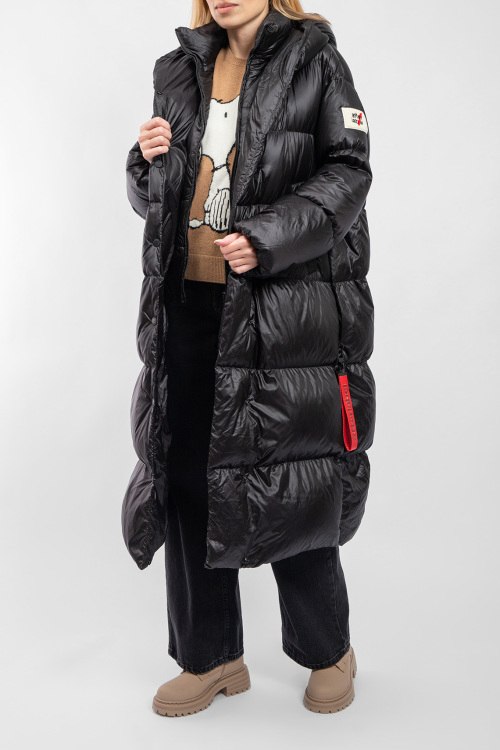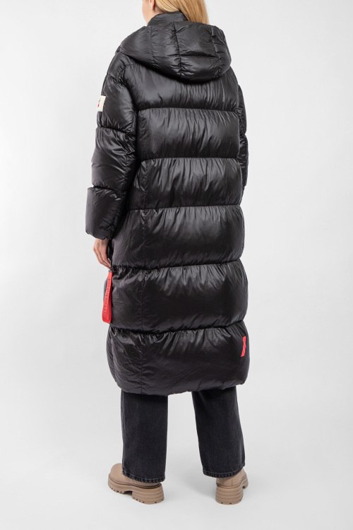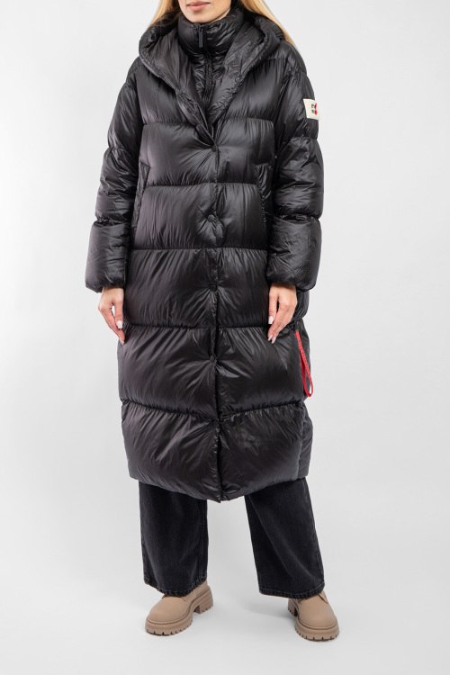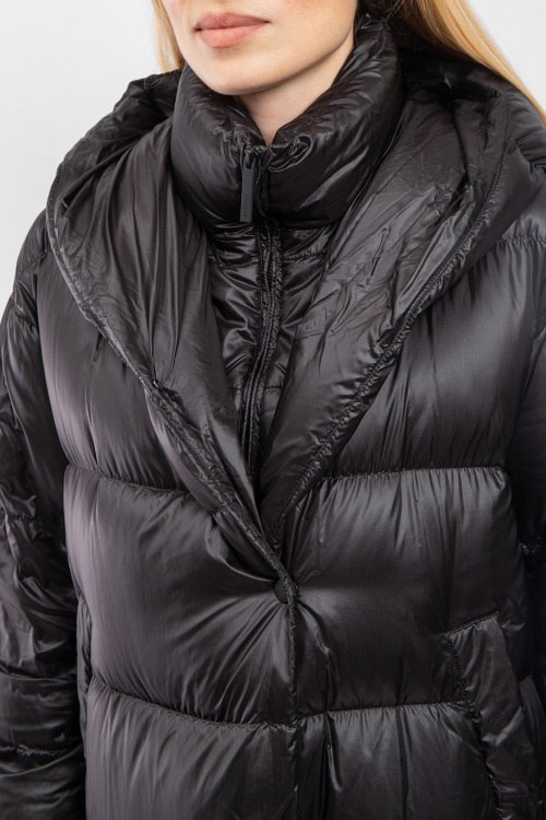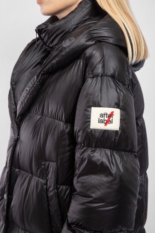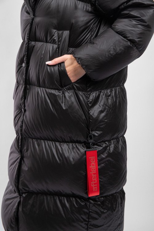 Детали: Женское черное пальто на пуху от After Label (Афтер Лейбл). Стеганый дизайн, высокий воротник, вшитый капюшон, нашивка с логотипом на рукаве, боковые карманы на молнии, застежка на молнию и кнопки, вшитые внутренние шлейки, длина-миди, наполнитель из микса пуха и пера