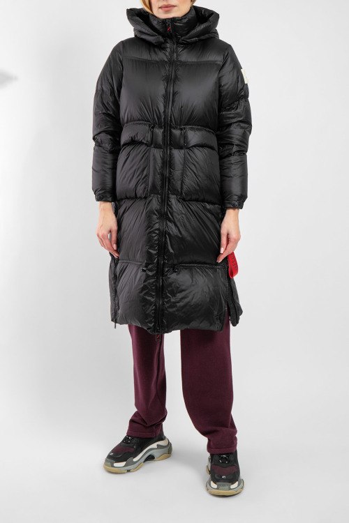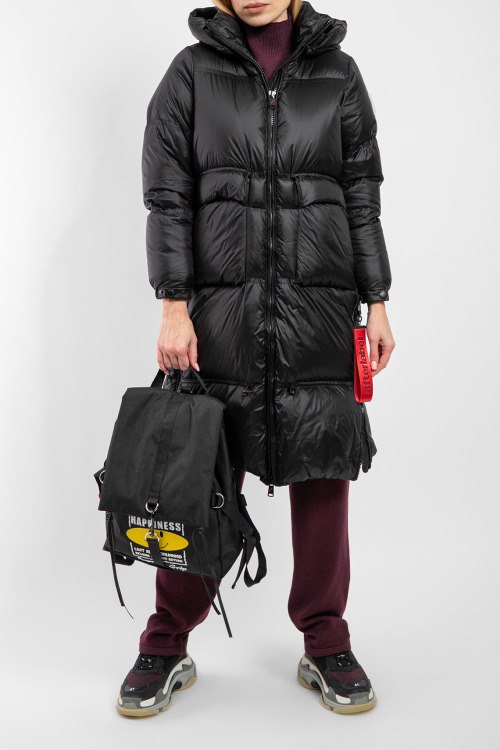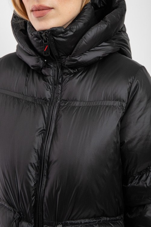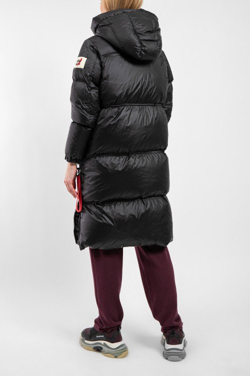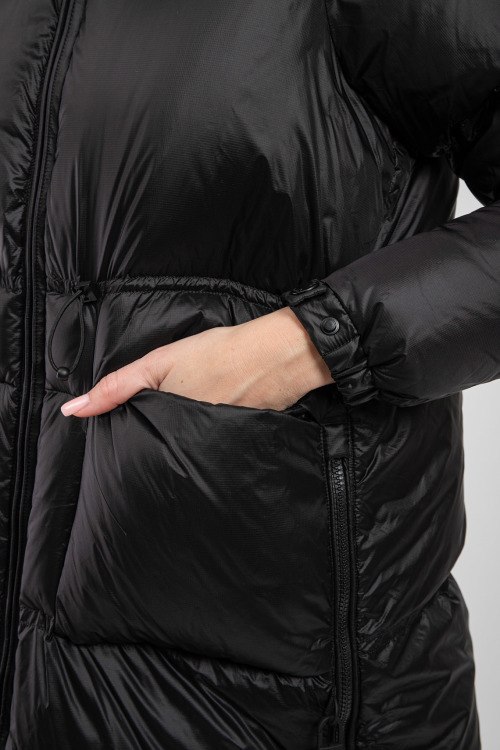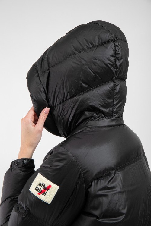 Женская черная куртка из полиамида от After Label (Афтер Лейбл). Удлиненная модель, высокий воротник-стойка, застежка на молнию, вшитый капюшон, эластичные бретели, кулиска по линии талии, накладные карманы с клапаном, по бокам молнии, модель утепленная миксом из пуха и пера, патч-лого.