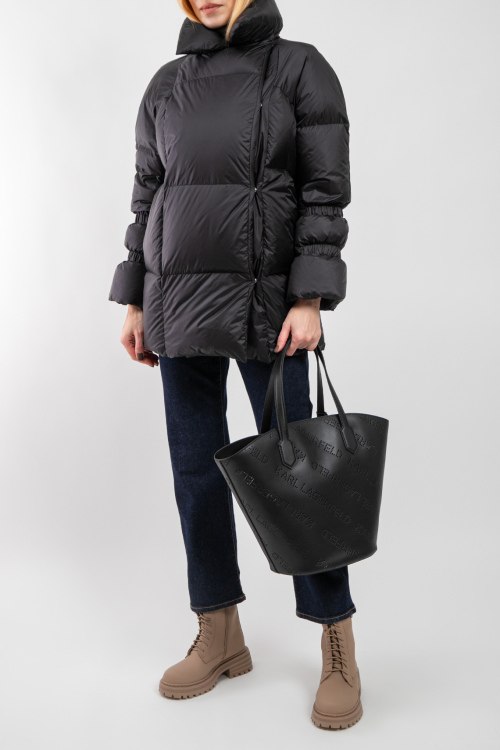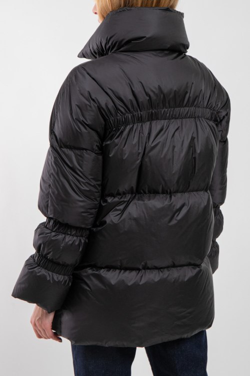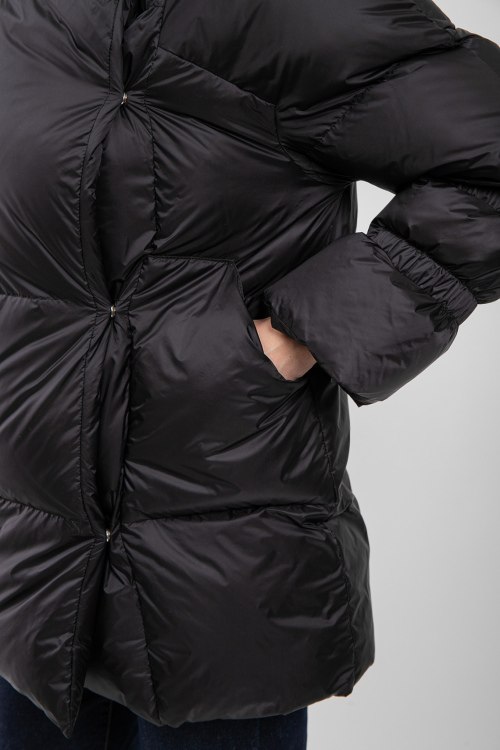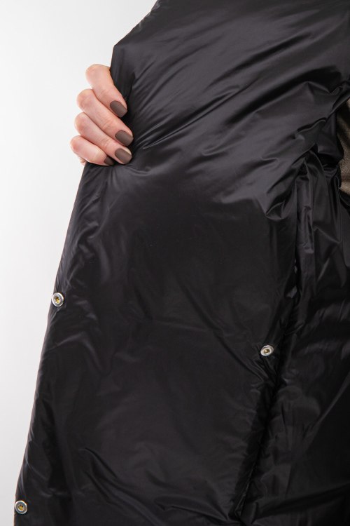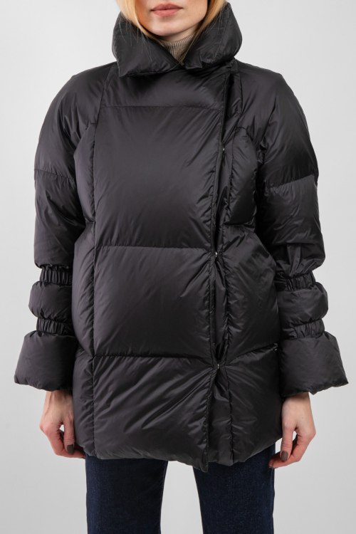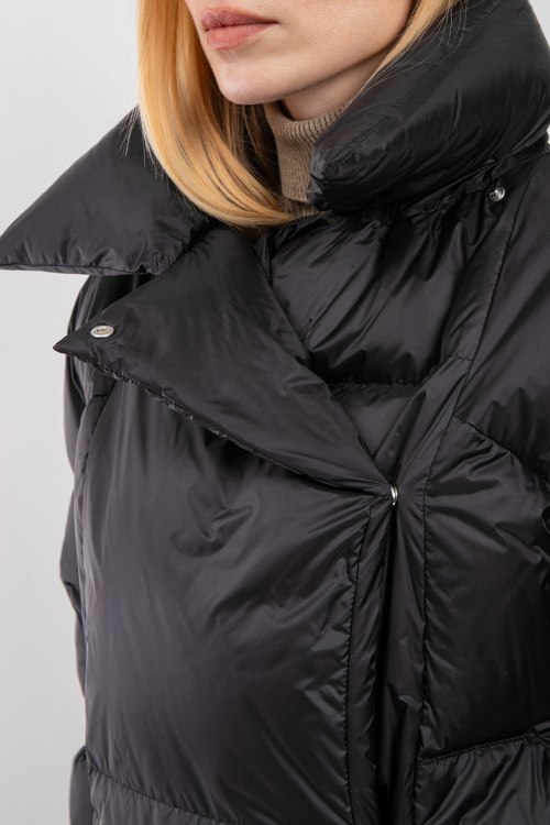 Женская черная куртка на пуху от Blanchett Goose (Бланшетт Гус). Стеганый дизайн, высокий воротник, боковые карманы, застежка на кнопки сбоку, удлиненная длина, наполнитель из микса пуха и пера.