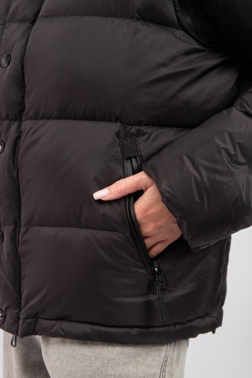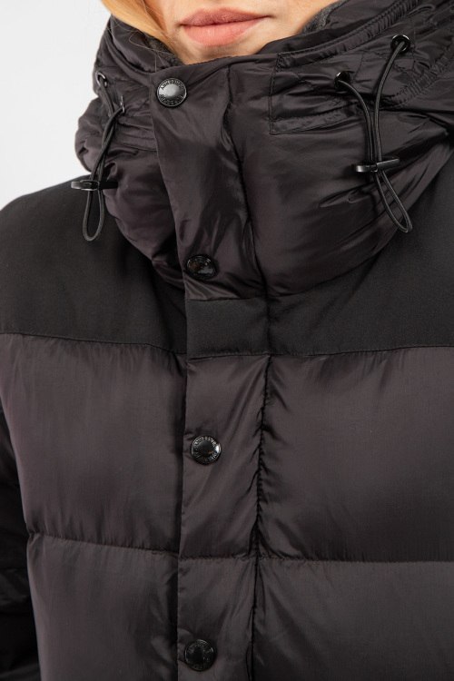 Детали: Женская черная куртка на пуху с капюшоном от Burberry (Бёрберри). Стеганый дизайн, высокий воротник, вшитый капюшон, нашивка с логотипом на рукаве, боковые карманы на молнии, застежка на молнию и кнопки, классическая длина, наполнитель из микса пуха и пера. Комплектация: фирменные кофр, подарочный пакет