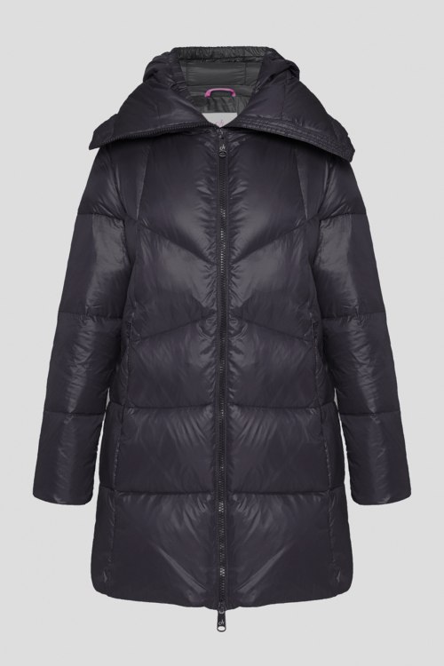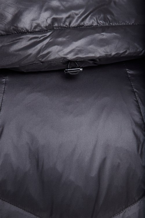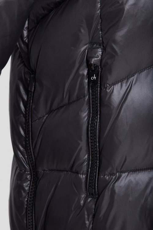 Детали: Женская черная куртка на пуху от Deha (Деха). Стеганый дизайн, вшитый капюшон, объемный отложной воротник, боковые карманы на молнии, застежка-молния, удлиненная длина, наполнитель из микса пуха и пера. Замеры: длина рукава: длинный, для размера S - 62 см, обхват груди: для размера S - 114 см, обхват талии: для размера S - 118 см, длина изделия по среднему шву спинки от горловины: для размера S - 82 см