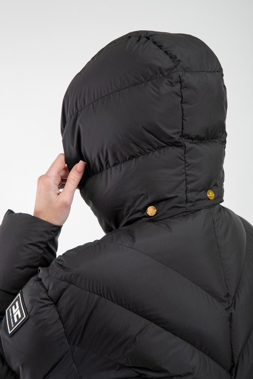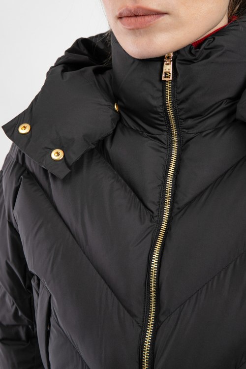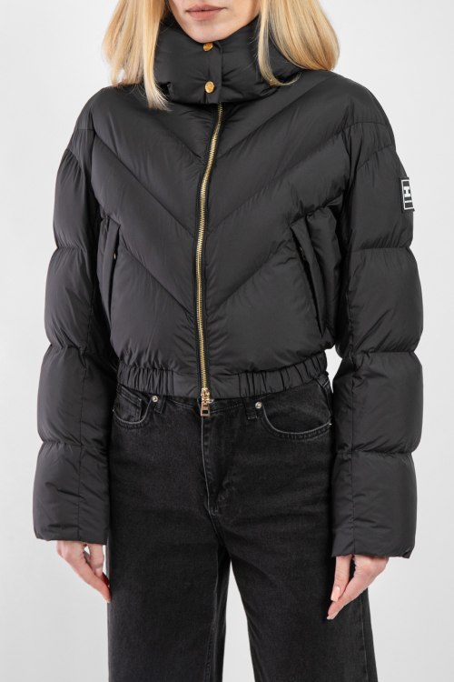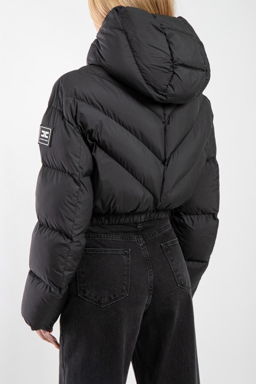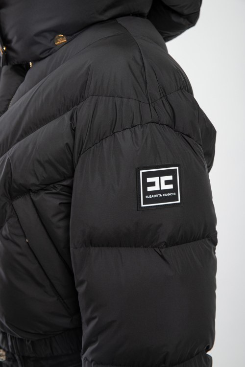 Женская черная утепленная куртка от Elisabetta Franchi (Елизабетта Франчи). Стеганый дизайн, съемный капюшон, высокий воротник, нашивка с логотипом на рукаве, боковые карманы на молнии, застежка-молния, укороченная длина, нижний край на резинке.