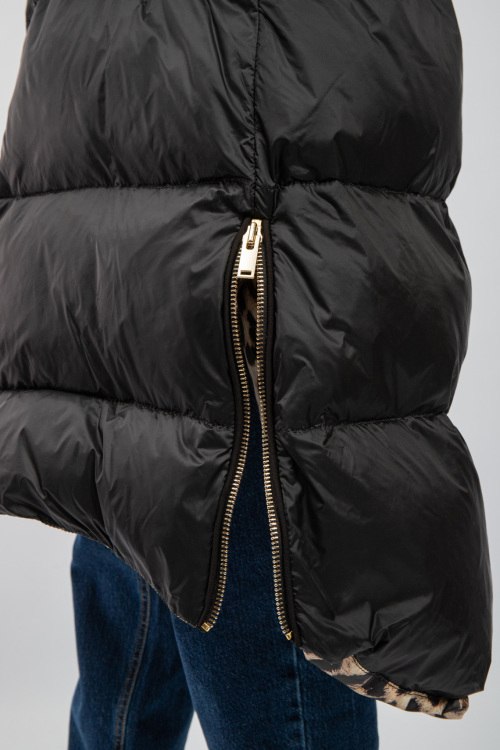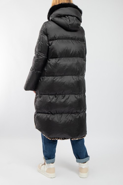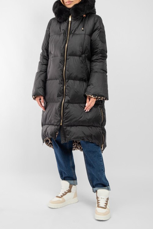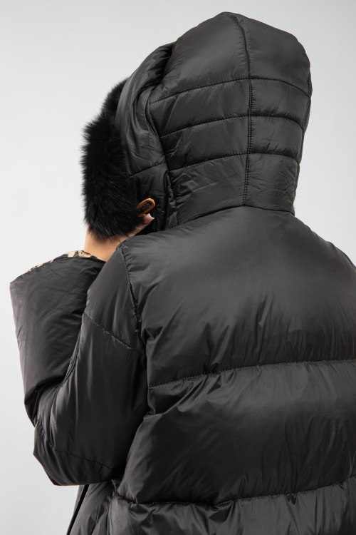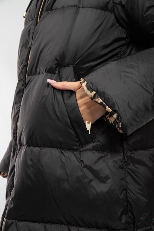 Женское черное пальто на пуху от Flo & Clo (Фло энд Кло). Стеганый дизайн, вшитый капюшон с меховой отделкой, нашивка с логотипом на рукаве, боковые карманы, застежка-молния, функциональные молнии по бокам, длина-миди, леопардовая подкладка, наполнитель из микса пуха и пера. На модели снят размер - 40. Параметры модели: рост 177 см, 88-62-90 см. Замеры: длина: 101 см, ширина по груди 62 см, ширина по талии 63 см, ширина по бедрам: 68 см, рукав 51 см (по внутреннему шву), ширина рукава: 22 см