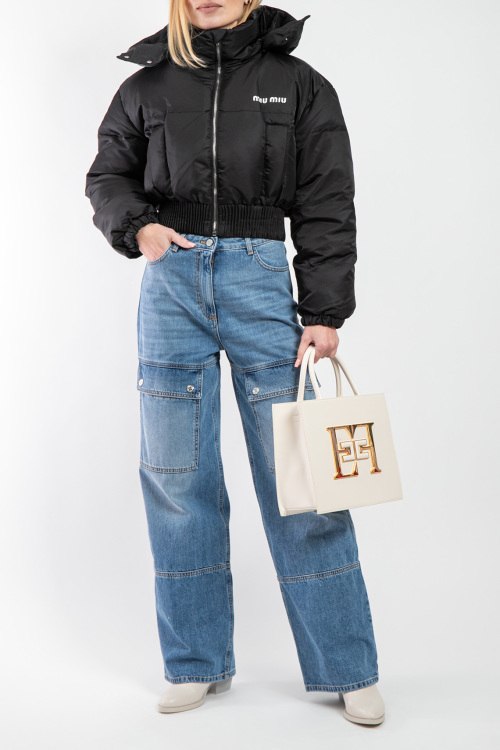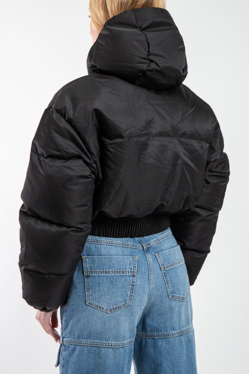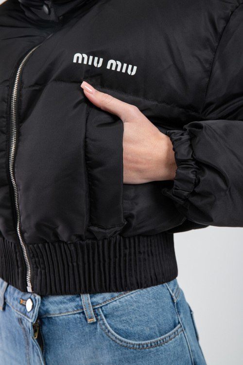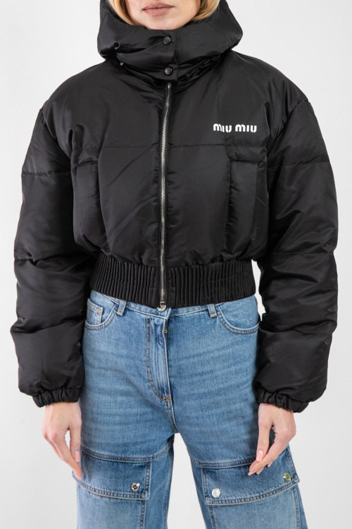Женская черная куртка на пуху от Miu Miu (Миу Миу). Стеганый дизайн, съемный капюшон, высокий воротник, принт с логотипом на груди, боковые карманы, застежка-молния, манжеты и нижний край на резинке, укороченная длина, наполнитель из микса пуха и пера.