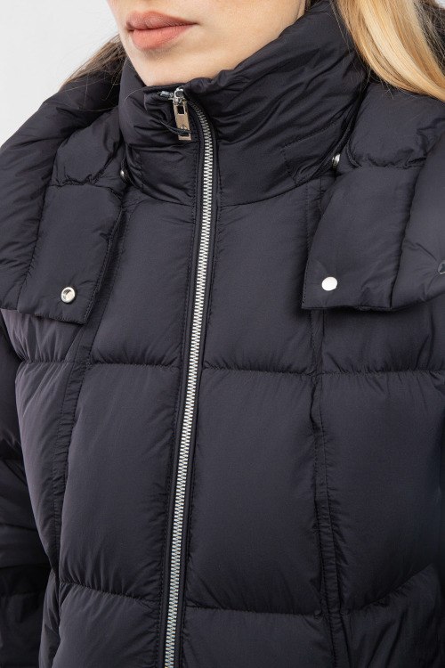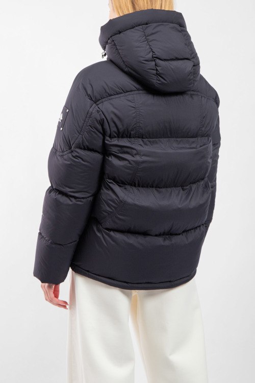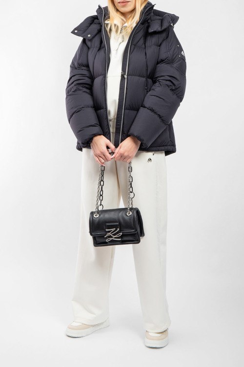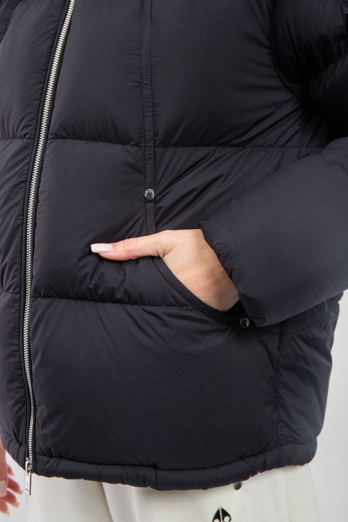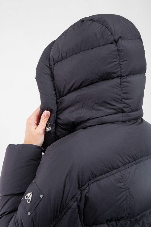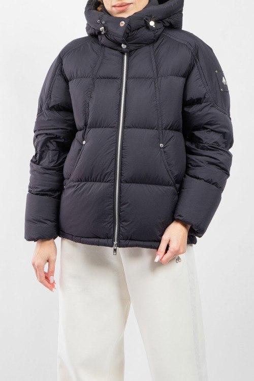 Женская черная куртка на пуху со съемным капюшоном Lejeune от Moose Knuckles (Мус Наклс). Стеганый дизайн, высокий воротник, съемный капюшон, нашивка с логотипом на рукаве, боковые карманы, застежка-молния, классическая длина, наполнитель из микса пуха и пера.