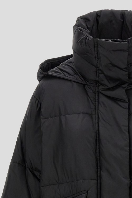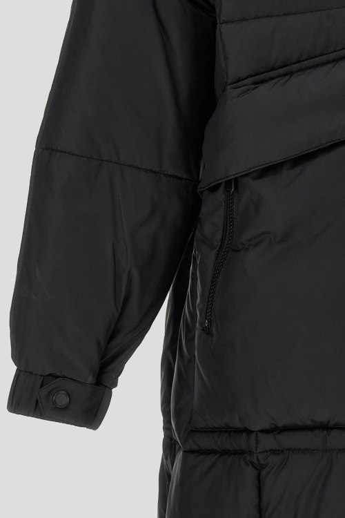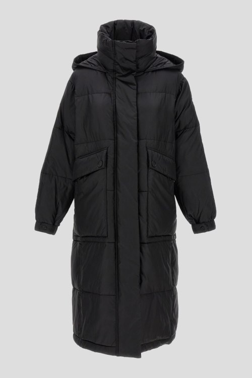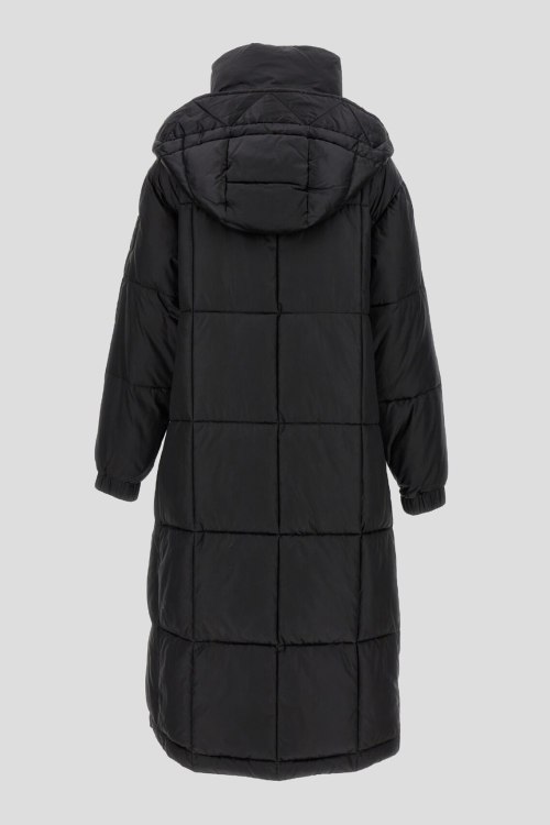 Детали: Женское черное утепленное пальто Insegna от Pinko (Пинко). Стеганый дизайн, вшитый капюшон, высокий воротник, передние накладные карманы, манжеты на резинке, застежка на молнию и кнопки, синтетический утеплитель, длина-миди