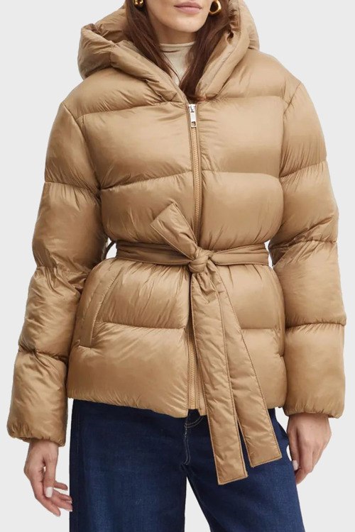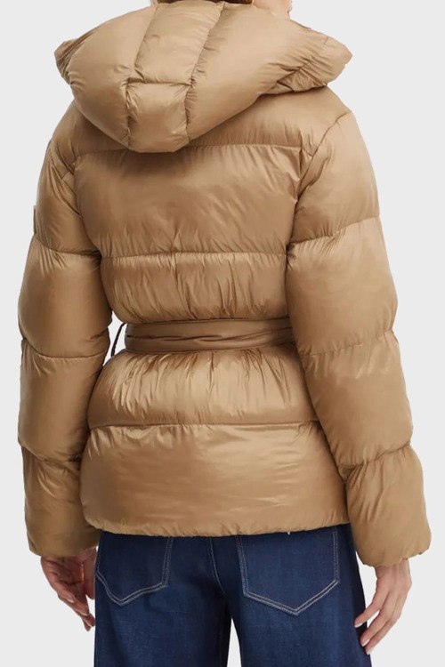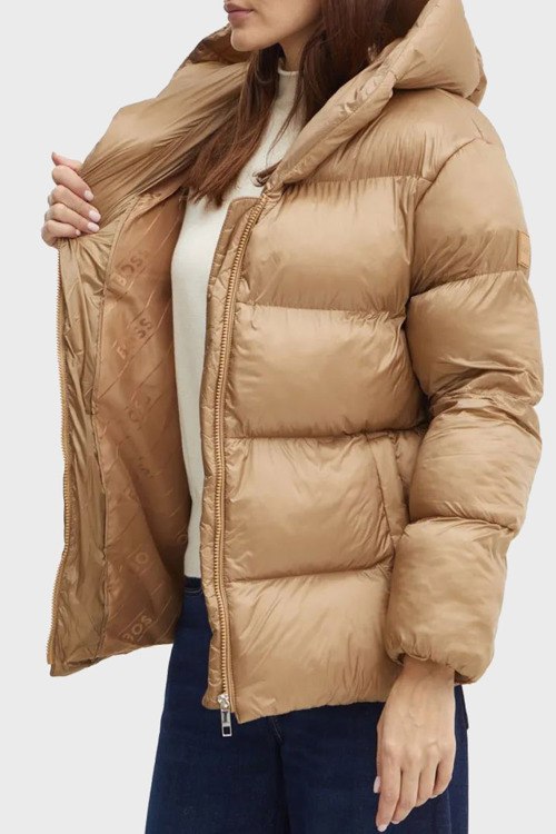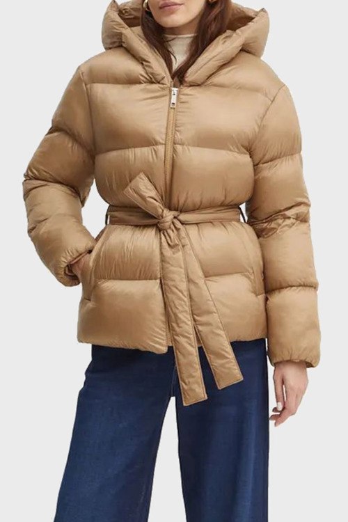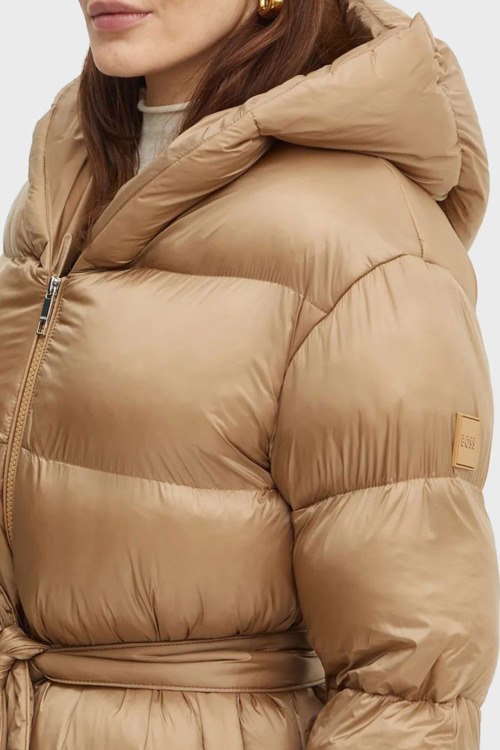 Детали: Женская коричневая куртка из полиэстера от Hugo Boss (Хуго Босс). Стеганый дизайн, застежка на молнию, вшитый капюшон, прорезные карманы, пояс в тон изделия, модель на синтепоне