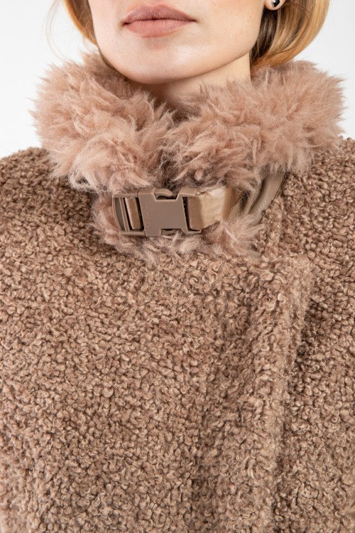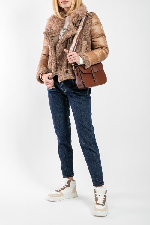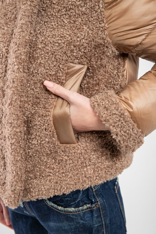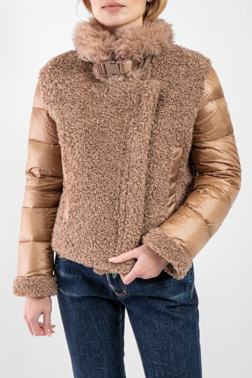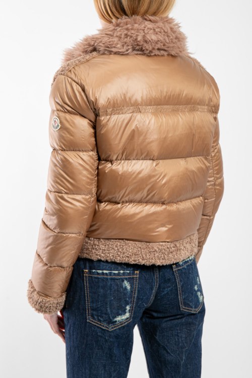 Женская коричневая куртка на пуху от Moncler (Монклер). Стеганый дизайн, меховая вставка teddy, высокий воротник из натурального меха, нашивка с логотипом на рукаве, боковые карманы, застежка-молния, классическая длина, наполнитель из микса пуха и пера.