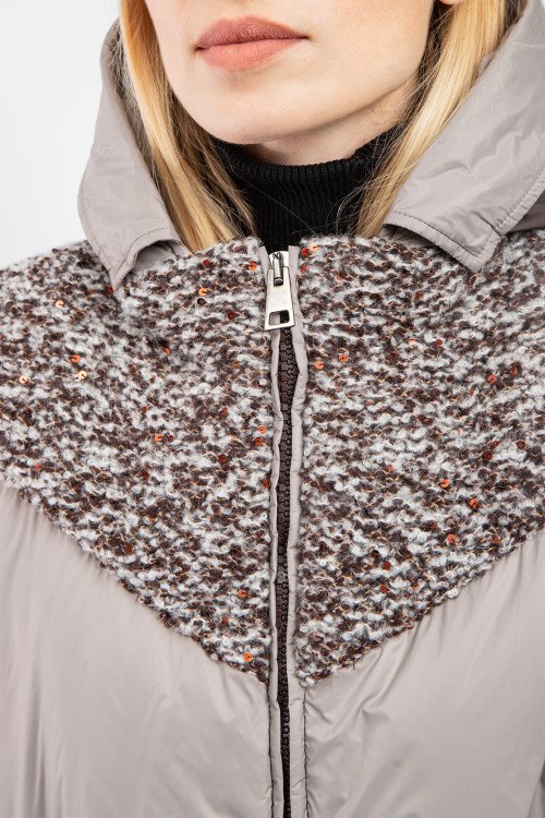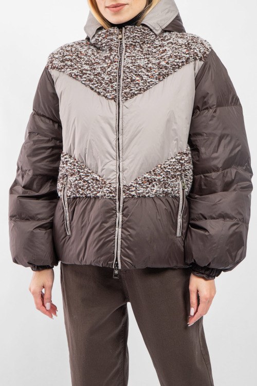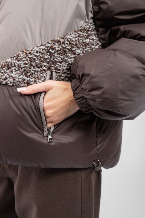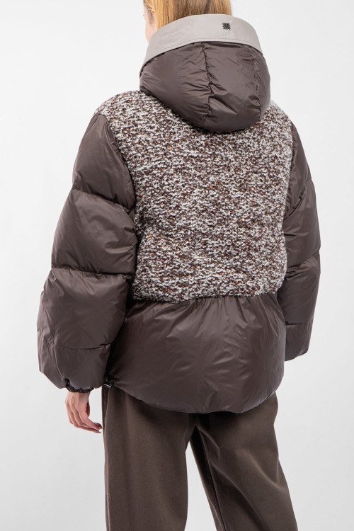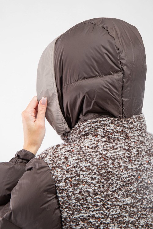 Женская темно-коричневая куртка на пуху от Panicale Cashmere (Паникале Кашемир). Шерстяные вставки с пайетками, стеганый дизайн, вшитый капюшон, боковые карманы на молнии, застежка-молния, манжеты на резинке, классическая длина, наполнитель из микса пуха и пера.