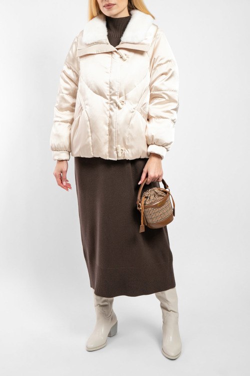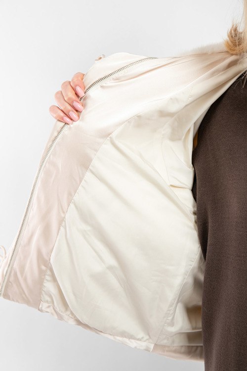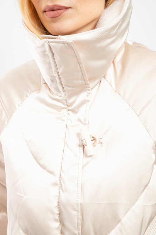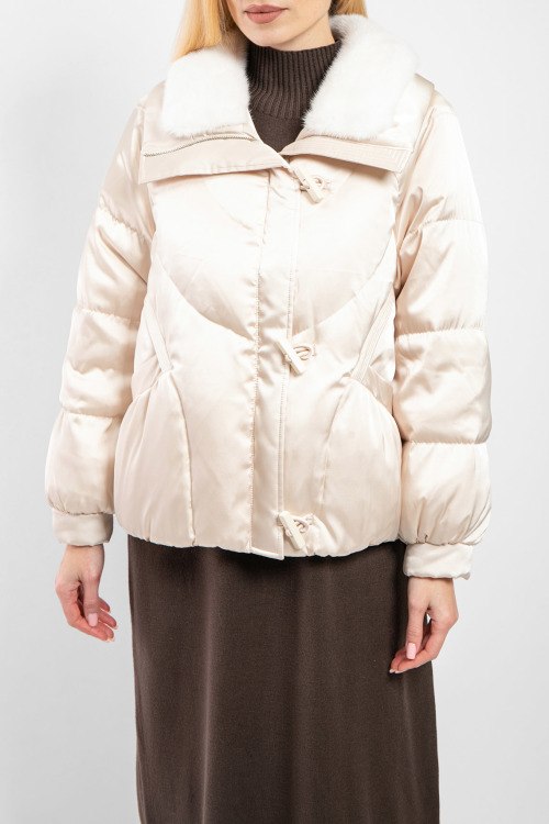 Женская пудровая куртка на пуху от Balenciaga (Баленсиага). Модель с примесью шелка, высокий воротник с меховой отделкой, передние карманы, застежка на молнию и петли, классическая длина, пуховый наполнитель.