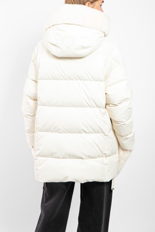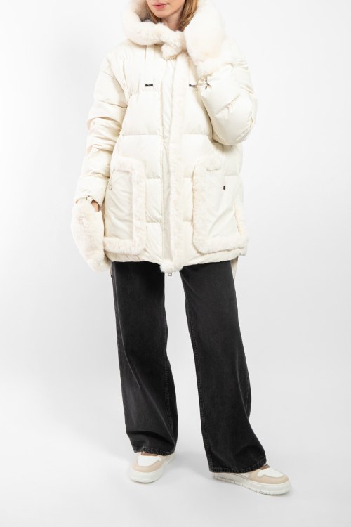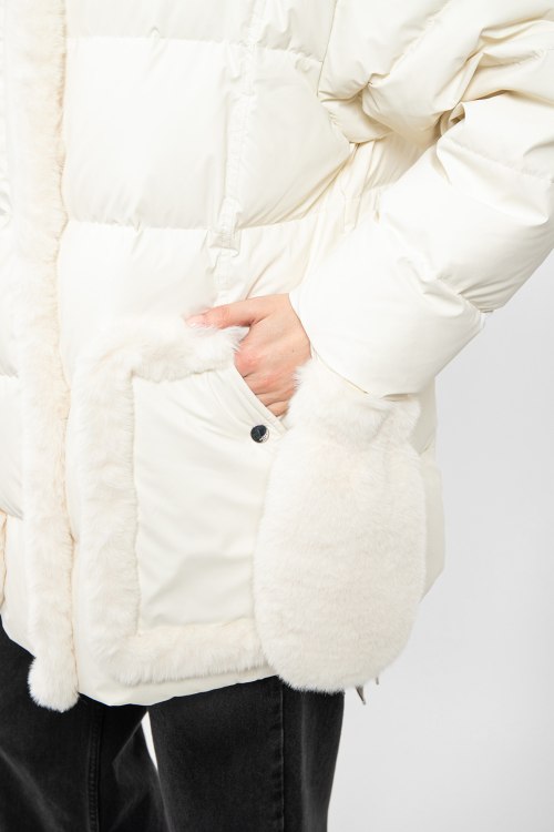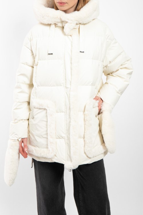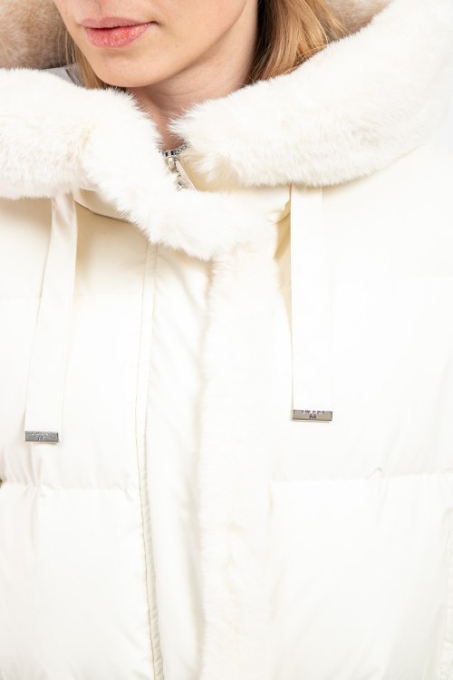 Женская куртка молочного оттенка из полиэстера от Diego M (Диего М). Застежка на молнию и кнопки, вшитый капюшон, не съемные варежки прячутся в потайной карман в рукаве, ткань прорезинена с водоотталкивающим эффектом, меховая отделка, накладные карманы, модель утепленная миксом из пуха и пера. Замеры для размера 44: Длина: 76 см, ширина по груди: 64 см, ширина по талии: 64 см, длина рукава по внутреннему шву: 44 см, ширина рукава: 24 см.