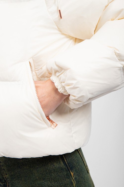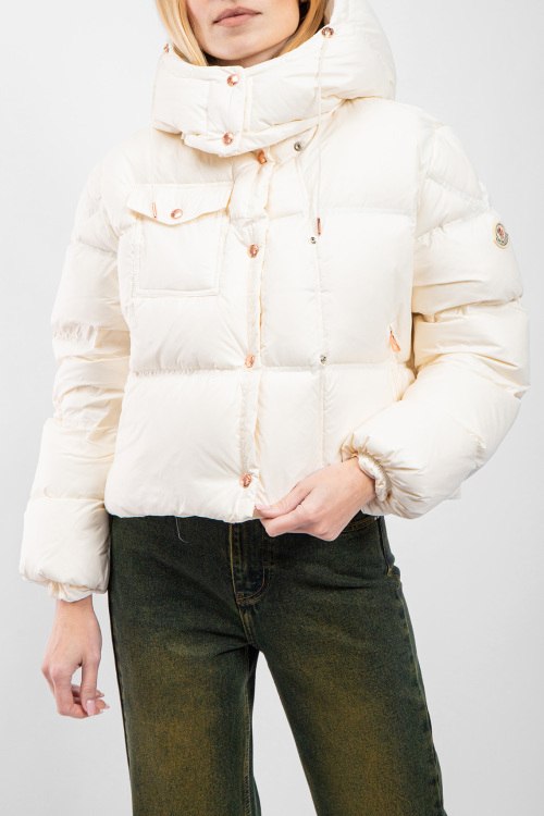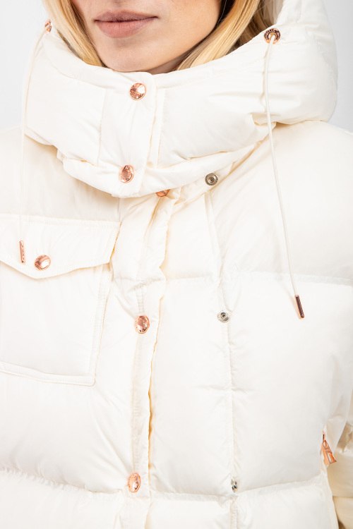 Детали: Женская кремовая куртка на пуху Erea от Moncler (Монклер). Стеганый дизайн, высокий воротник, съемный капюшон, нашивка с логотипом на рукаве, боковые карманы на молнии, карман с клапаном на груди, застежка на кнопки, классическая длина, наполнитель из микса пуха и пера. Размер: 2 (L): ширина по груди 60 см, ширина по низу 60 см, длина по переду 54 см