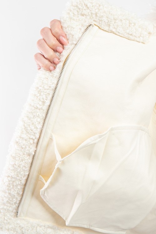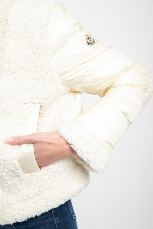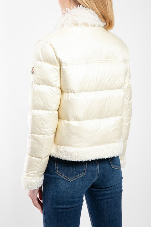 Женская кремовая куртка на пуху от Moncler (Монклер). Стеганый дизайн, меховая вставка teddy, высокий воротник из натурального меха, нашивка с логотипом на рукаве, боковые карманы, застежка-молния, классическая длина, наполнитель из микса пуха и пера.