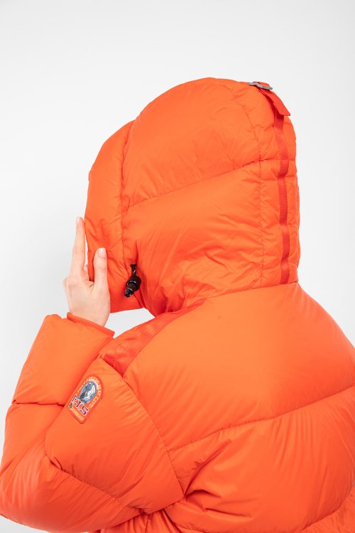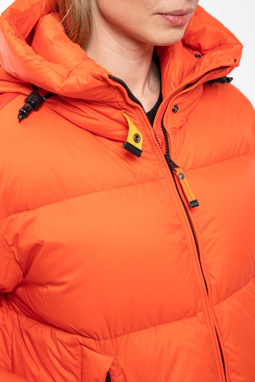 Женская оранжевая куртка из полиамида от Parajumpers (Параджамперс). Стеганый дизайн, вшитый капюшон, застежка на молнию, прорезные карманы на молнии, патч-лого, модель утепленная миксом из пуха и пера.