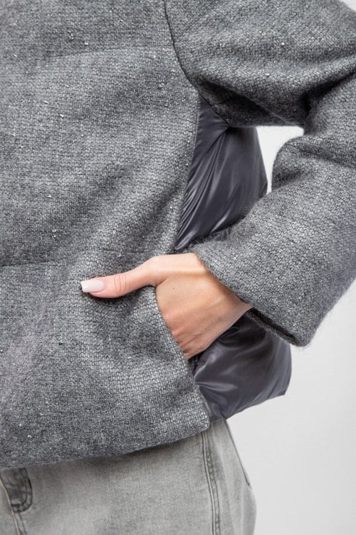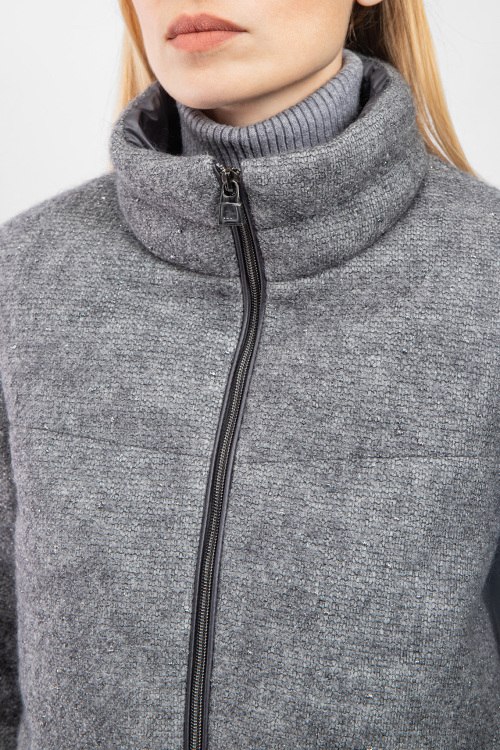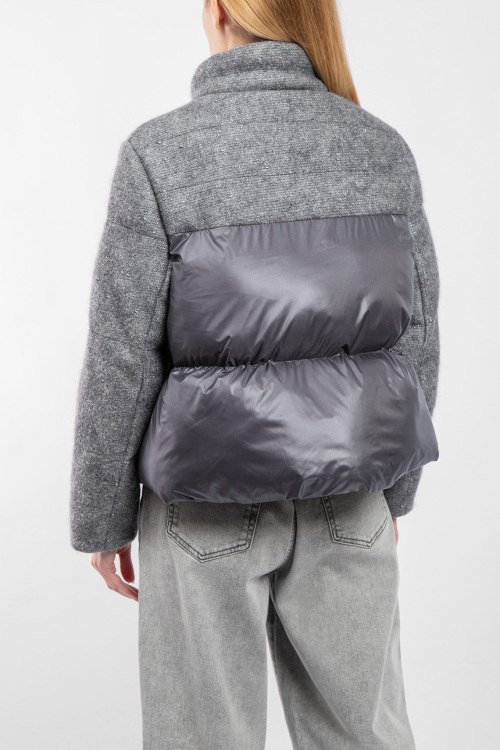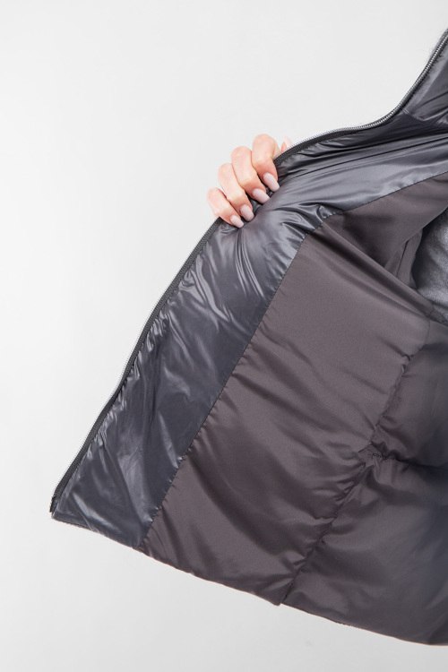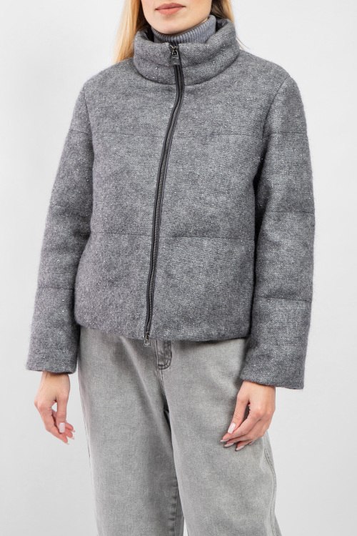 Женская серая утепленная куртка от Diego M (Диего М). Модель с люрексом, стеганая вставка на спинке, высокий воротник, боковые карманы, застежка-молния, классическая длина. Замеры для размера 40: длина: 56 см, ширина груди 58 см, ширина по талии 60,5 см, длина по внутреннему шву рукава 43 см, ширина рукава 20,5 см, ширина по плечам 44 см.