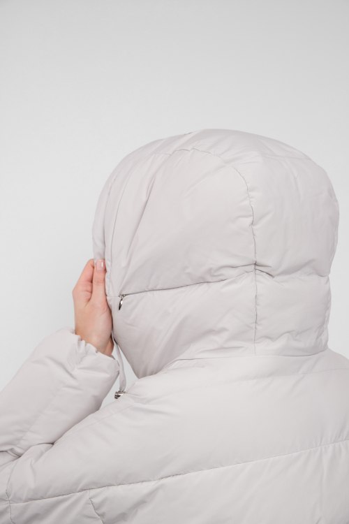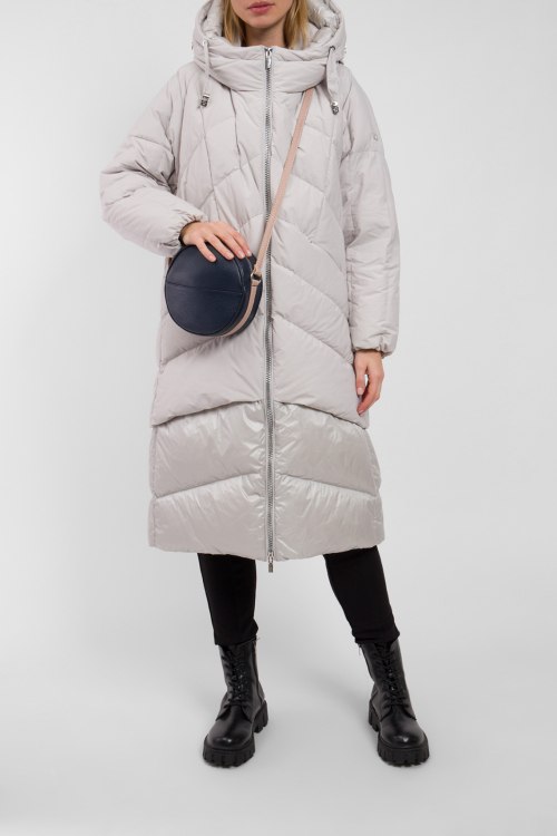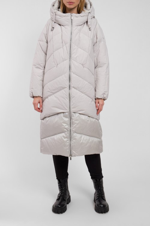 Женское серое пальто из полиэстера от Diego M (Диего М). Стеганый дизайн, длина миди, вшитый капюшон с регулируемой глубиной, вышитый логотип бренда, глянцевая вставка по низу изделия, модель утепленная миксом из пуха и пера, прорезные карманы, металлический патч-лого на рукаве.