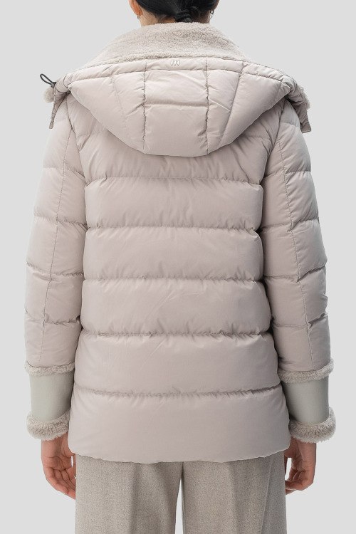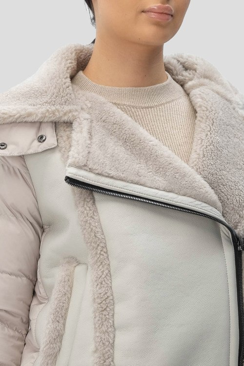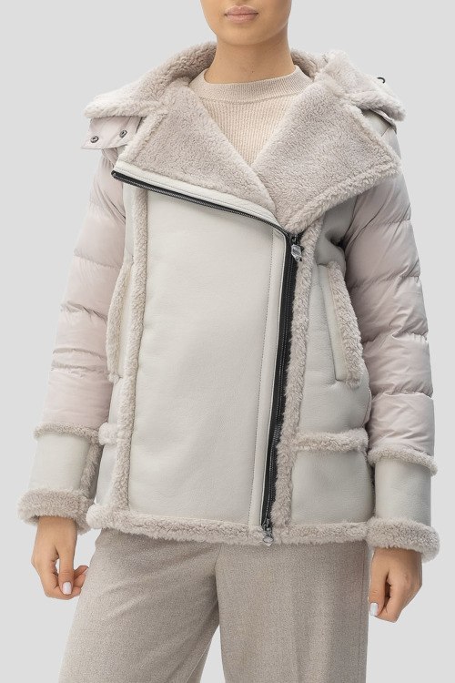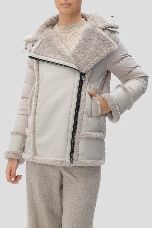 Детали: Женская светло-серая куртка-дубленка на пуху от Hetrego (Хетрего). Спереди вставка из экокожи, отложной меховой воротник, вшитый капюшон, стеганые рукава и спинка, боковые карманы, косая застежка-молния, классическая длина, наполнитель из микса пуха и пера
