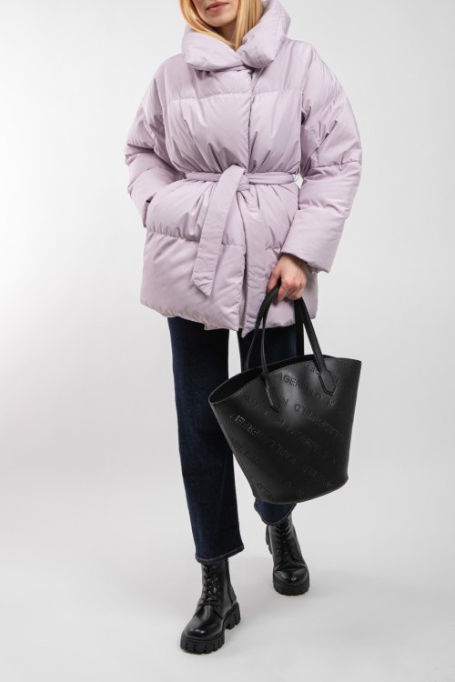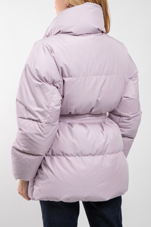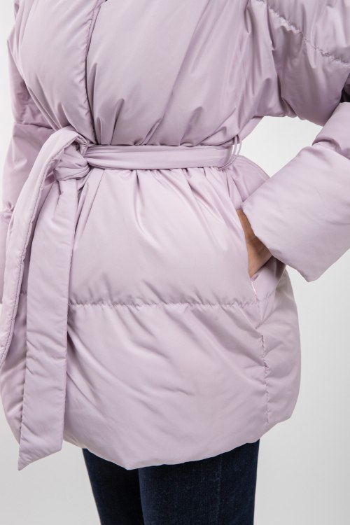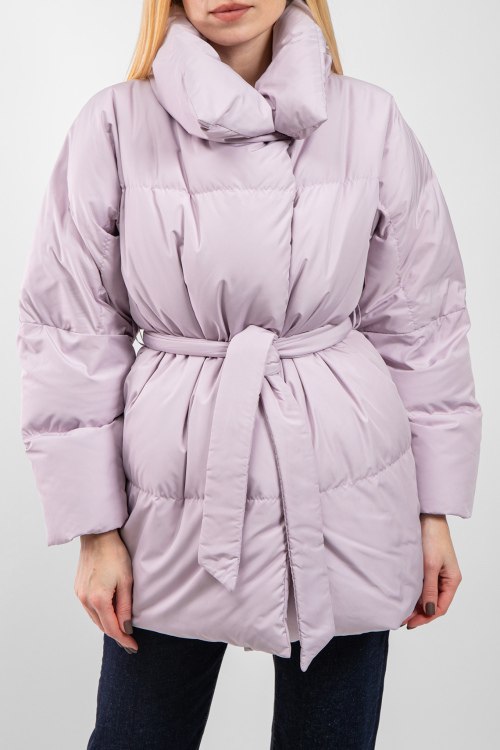 Женская сиреневая куртка на пуху от Blanchett Goose (Бланшетт Гус). Стеганый дизайн, высокий воротник, боковые карманы, застежка на кнопки сбоку, в талии с поясом, удлиненная длина, наполнитель из микса пуха и пера.