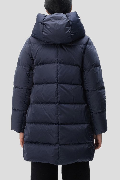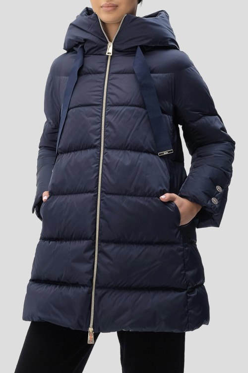 Детали: Женская темно-синяя куртка на пуху от Herno (Эрно). Стеганый дизайн, вшитый капюшон, боковые карманы, застежка-молния, низ рукава на кнопках, удлиненная длина, наполнитель из микса пуха и пера