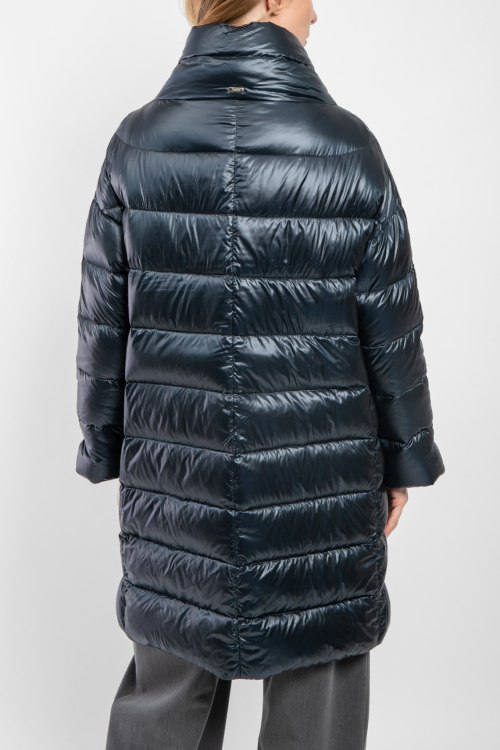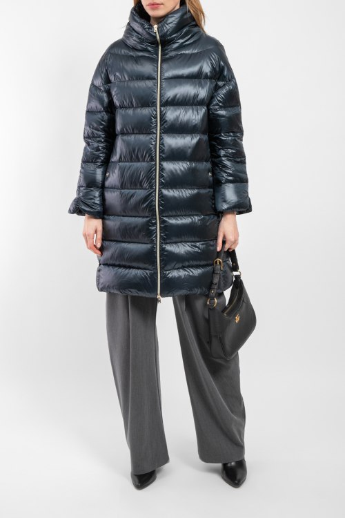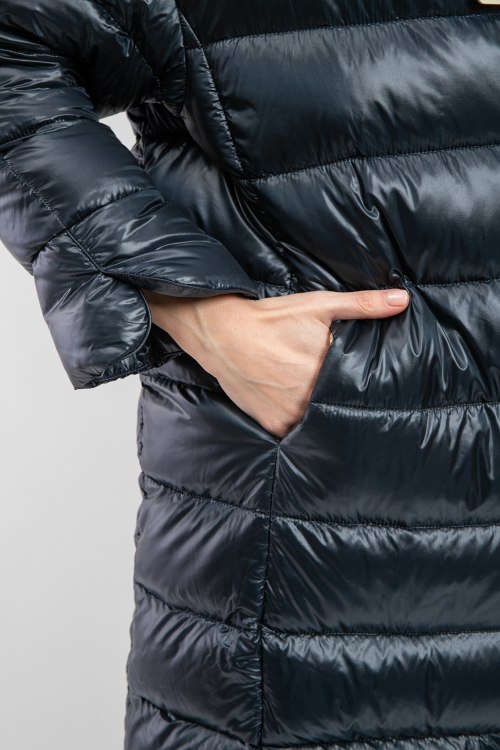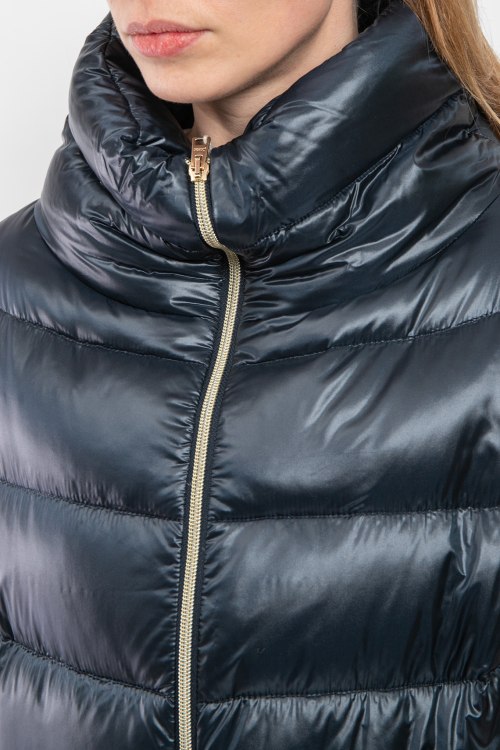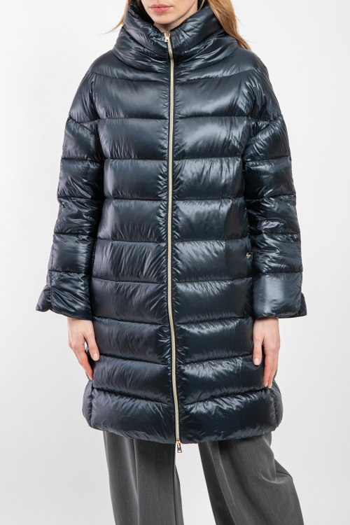 Женская темно-синяя куртка из полиамида от Herno (Эрно). Стеганый дизайн, воротник-стойка, застежка на молнию, модель утепленная миксом из пуха и пера, прорезные карманы, патч-лого.