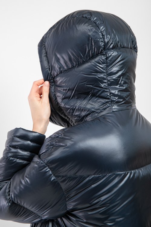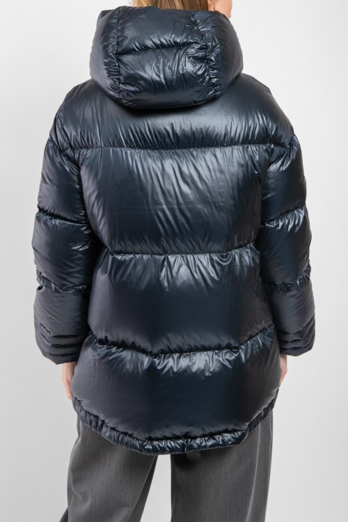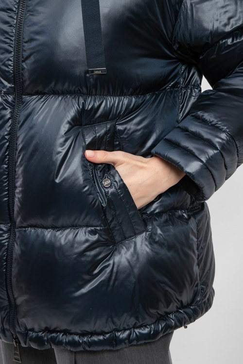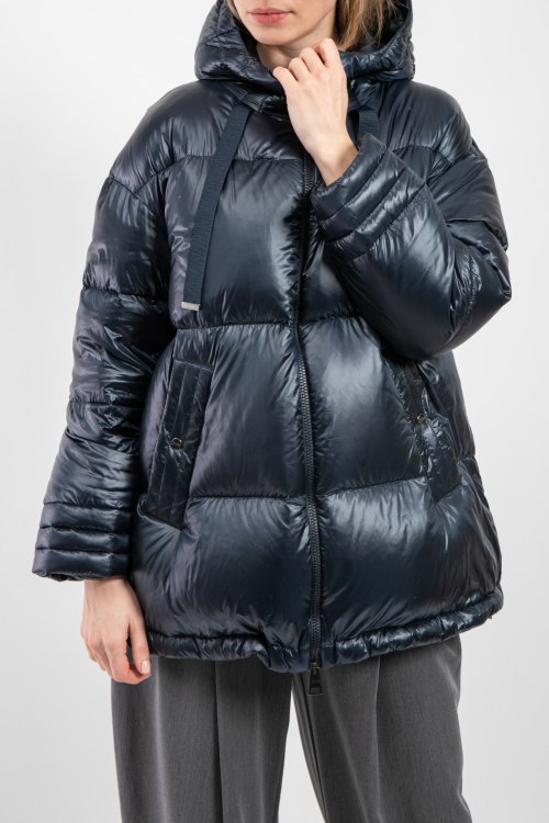 Женская темно-синяя куртка из полиамида от Herno (Эрно). Стеганый дизайн, воротник-стойка, застежка на молнию, вшитый капюшон, прорезные карманы, модель утепленная миксом из пуха и пера.