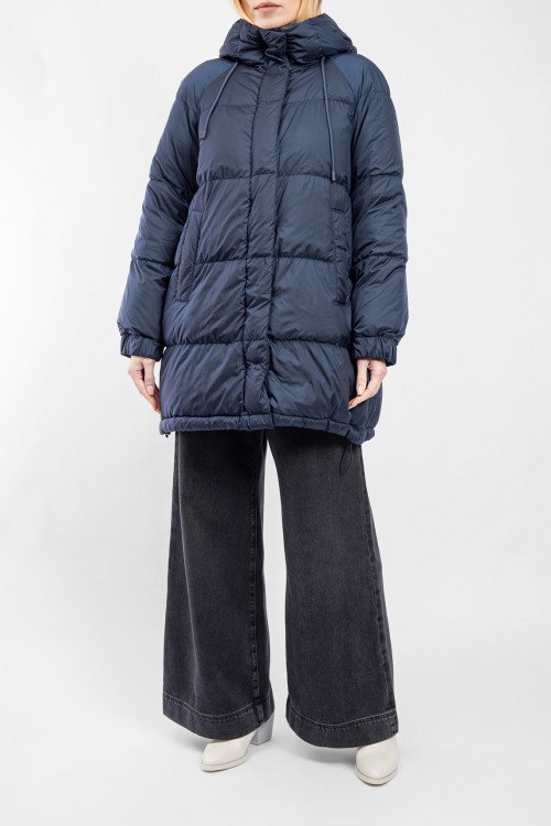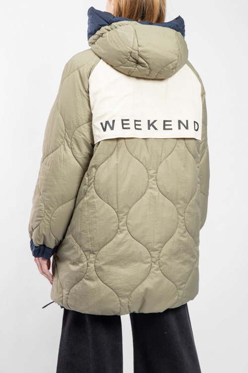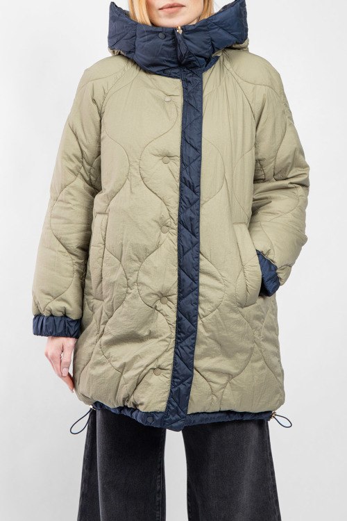 Женская темно-синяя двухсторонняя зимняя куртка Anfora от Max Mara Weekend (Макс Мара Викенд). Темно-синяя и оливковая сторона. Стеганый дизайн, вшитый капюшон, боковые карманы, застежка на молнию и кнопки, манжеты на резинке, удлиненная длина.
