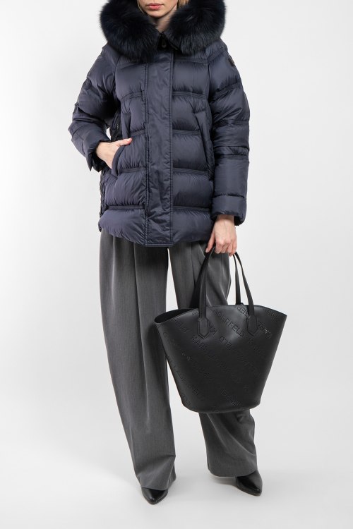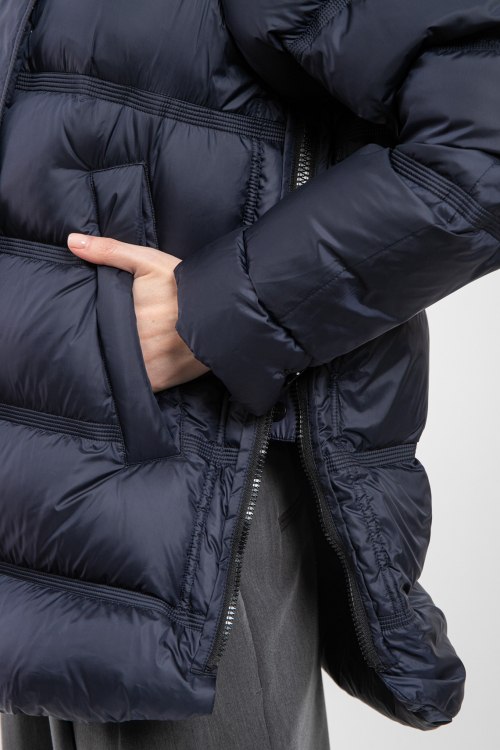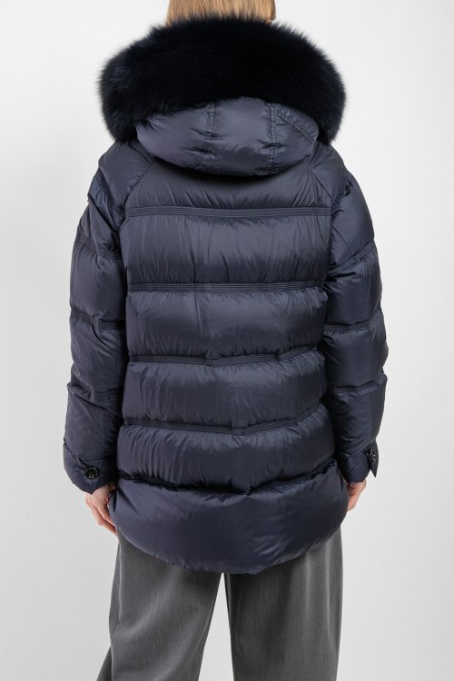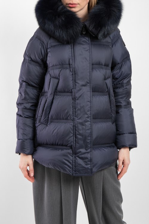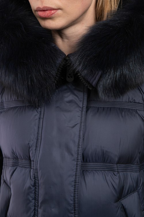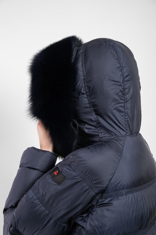 Детали: Женская темно-синяя куртка из полиэстера от Peuterey (Пьютерей). Стеганый дизайн, вшитый капюшон с меховой отделкой, застежка на молнию и кнопки, застежка-молния по бокам, фигурный низ изделия, модель утепленная миксом из пуха и пера, патч-лого