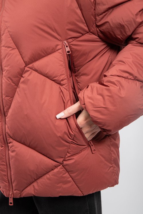 Детали: Женская терракотовая куртка на пуху Vardar от Moncler (Монклер). Стеганый узор, высокий воротник, нашивка см логотипом на рукаве, боковые карманы на молнии, застежка-молния, классич5еская длина, наполнитель из микса пуха и пера. Комплектация: фирменные коробка, кофр, подарочный пакет