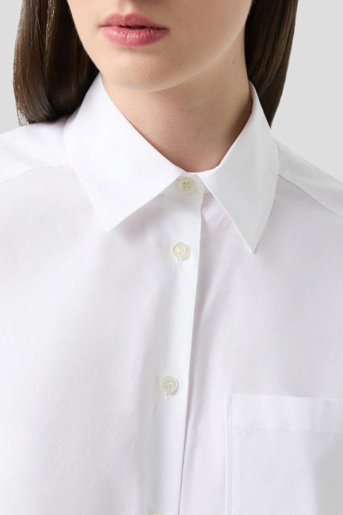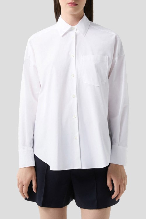 Детали: Женская белая хлопковая рубашка Nadine от Bogner (Богнер). Отложной воротник, карман на груди, застежка на пуговицы, манжеты на пуговицах, классическая длина