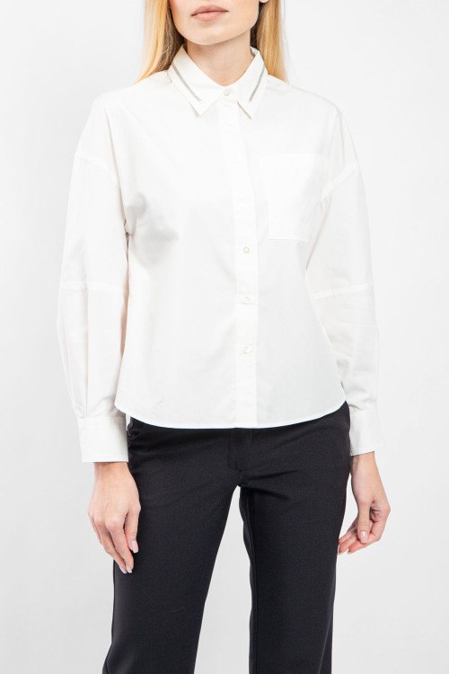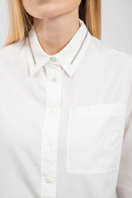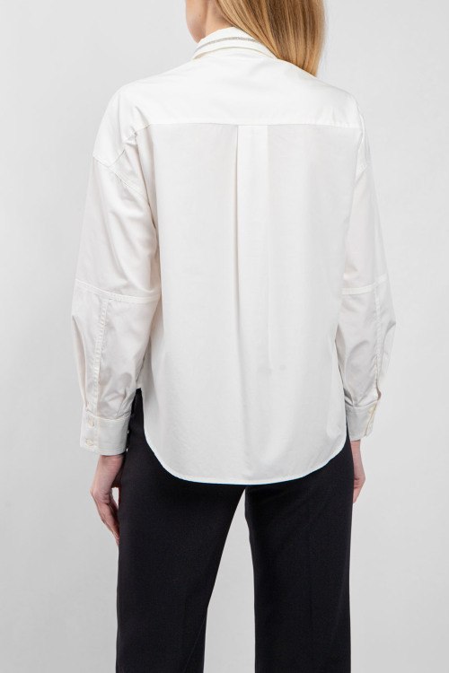 Детали: Женская белая хлопковая рубашка от Brunello Cucinelli (Брунелло Кучинелли). Отложной воротник декорирован кристаллами, накладной карман на груди, застежка на пуговицы, манжеты на пуговицах, классическая длина
