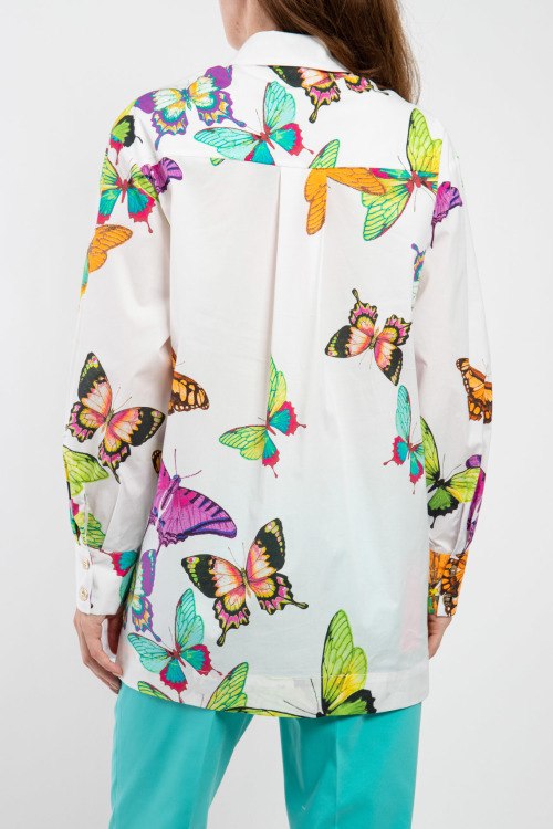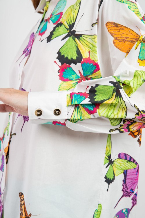 Женская белая хлопковая рубашка от Clips (Клипс). Принт с бабочками по всей поверхности, отложной воротник, застежка на пуговицы, рукав на манжетах, удлиненная длина.