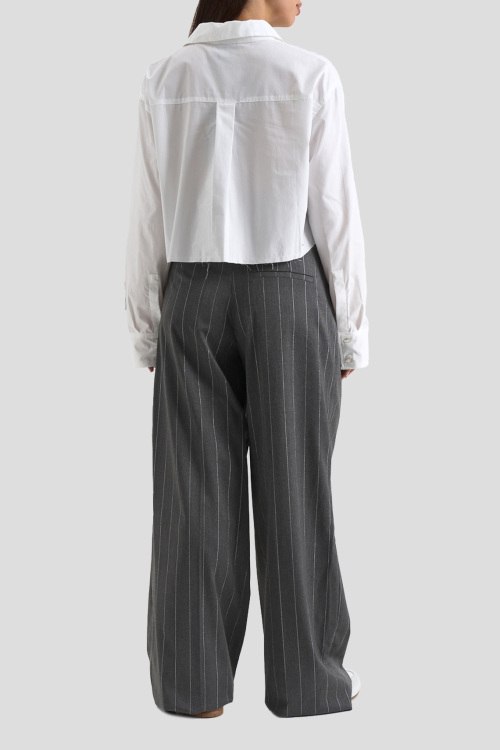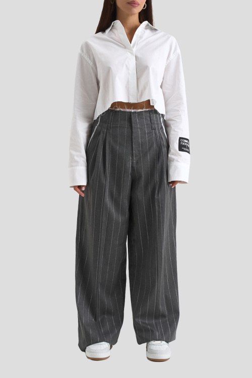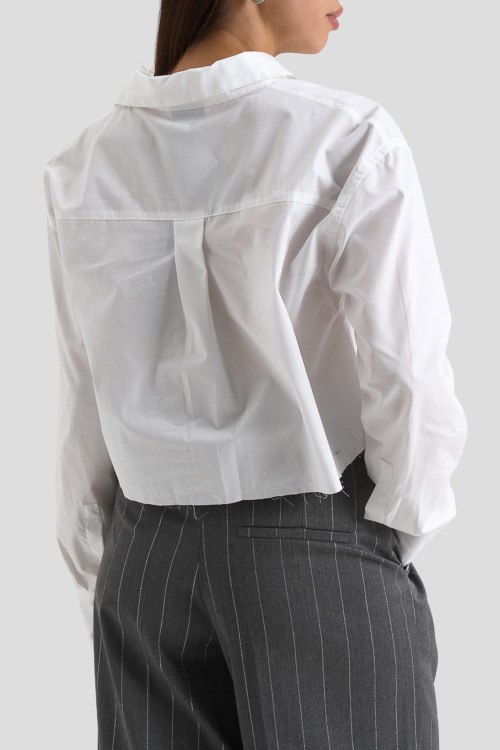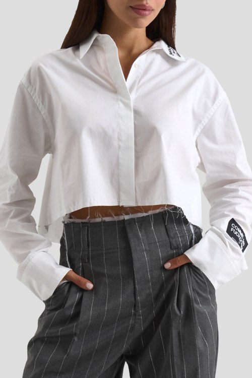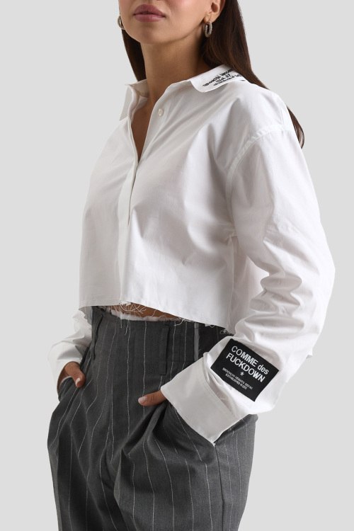 Детали: Женская белая рубашка из хлопка от Comme des Fuckdown (Камм дес Факдаун). Укороченная длина, классическая длина, застежка на пуговицы, необработанные края, длинные рукава, патч-лого, манжеты на пуговице