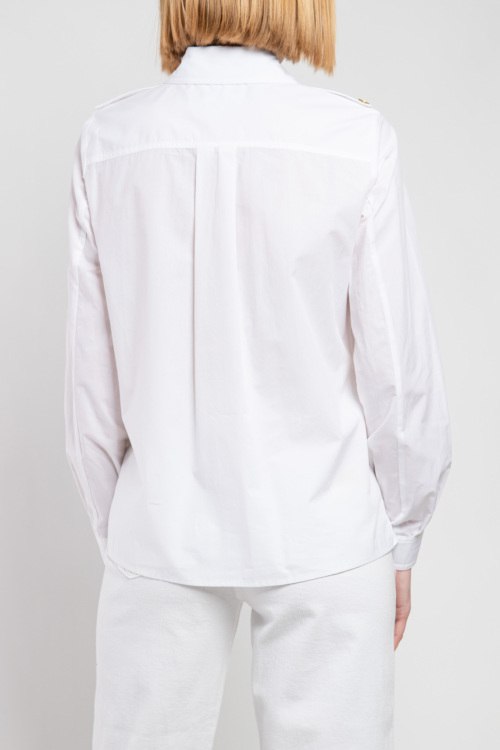 Детали: Женская белая хлопковая рубашка от Elisabetta Franchi (Елизабетта Франчи). Отложной воротник, скрытая застежка на пуговицы, два накладных кармана на груди, длинный рукав на манжетах, золотистые пуговицы с логотипом, классическая длина