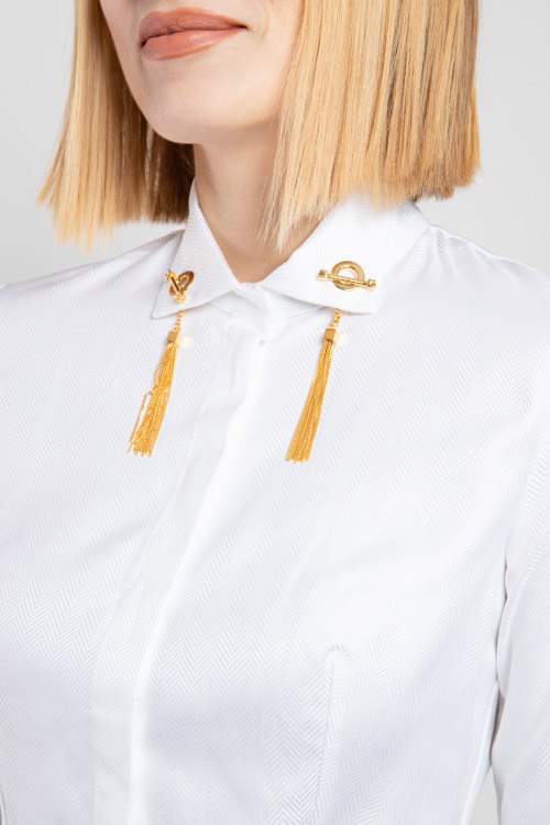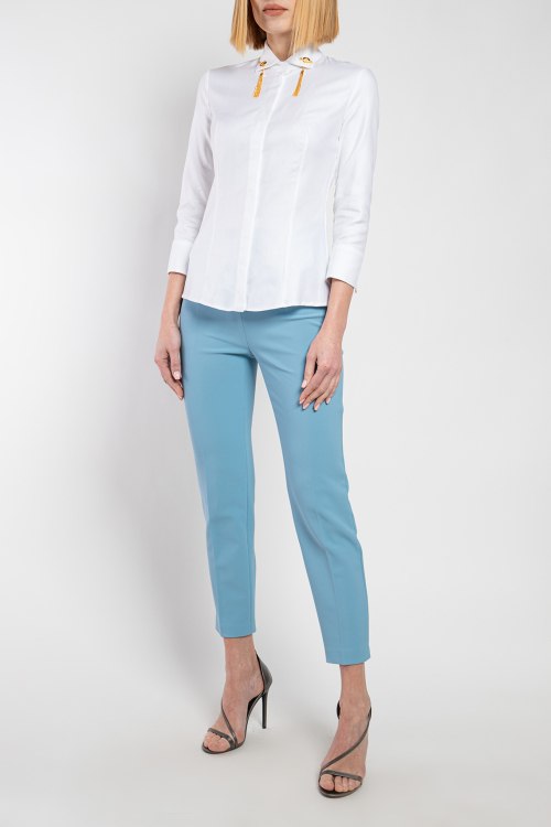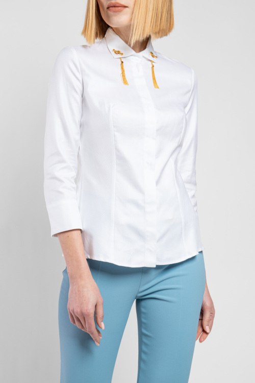 Детали: Женская белая хлопковая рубашка от Elisabetta Franchi (Елизабетта Франчи). Отложной воротник декорирован золотистыми подвесками, скрытая застежка на пуговицы, укороченный рукав 3/4, классическая длина