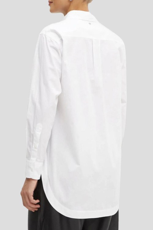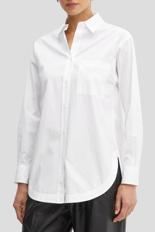 Детали: Женская белая рубашка из хлопка от Hugo Boss (Хуго Босс). Удлиненная модель, фигурный низ изделия, длинные рукава, классический воротник, застежка на пуговицы, нагрудный карман