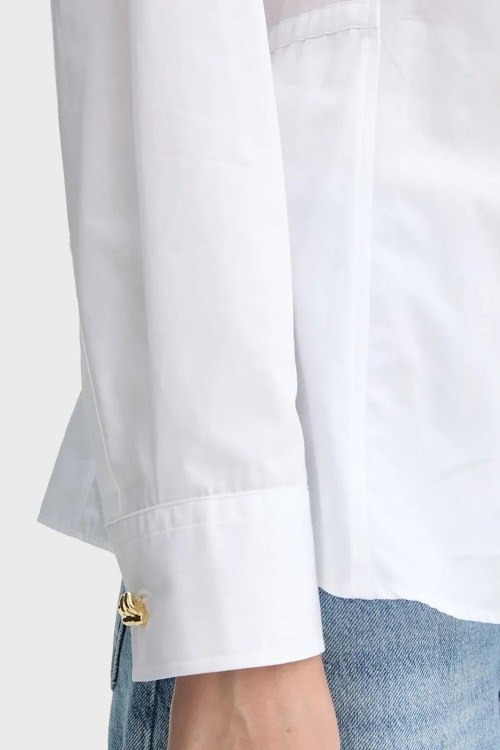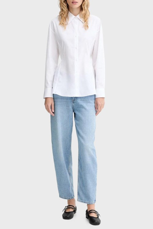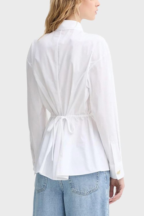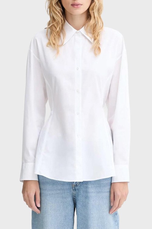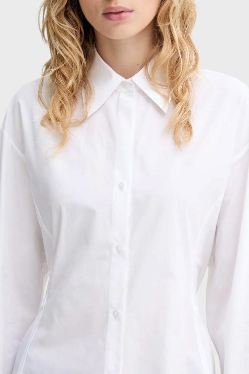 Детали: Женская белая хлопковая рубашка Etnaa от Hugo by Hugo Boss (Хуго бай Хуго Босс). Отложной воротник с заостренными лацканами, завязки на спине, застежка на пуговицы, классическая длина