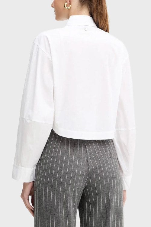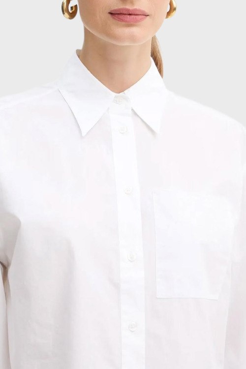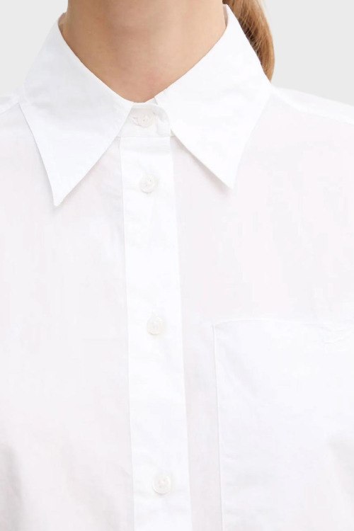 Детали: Женская белая хлопковая рубашка Boskota от Hugo Boss (Хуго Босс). Отложной воротник, карман на груди, длинный широкий рукав, укороченная длина