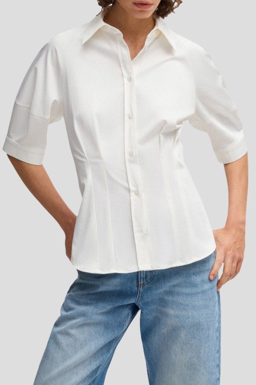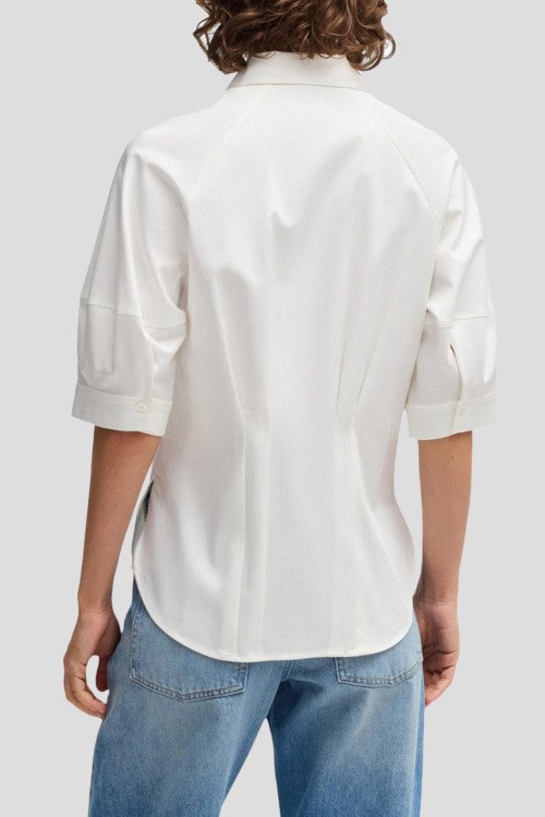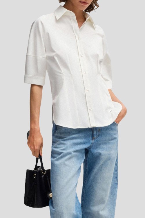 Детали: Женская белая рубашка Belaurena из хлопкового микса от Hugo Boss (Хуго Босс). Классический воротник, застежка на пуговицы, короткие рукава, фигурный низ изделия