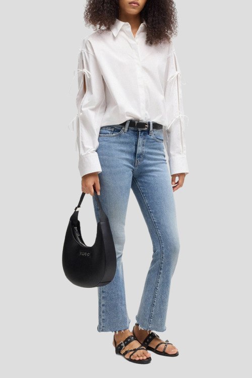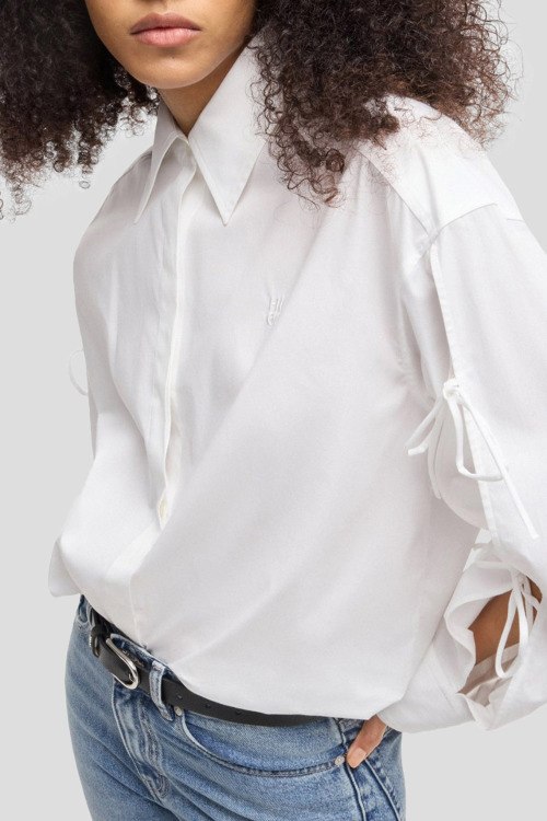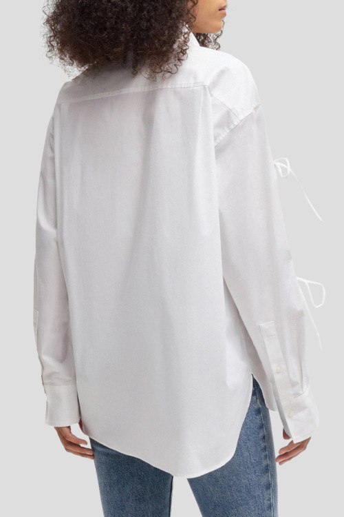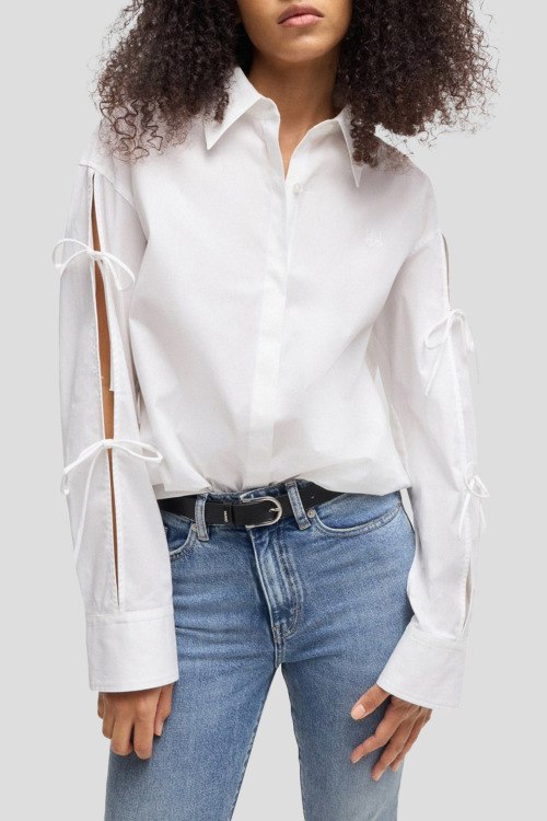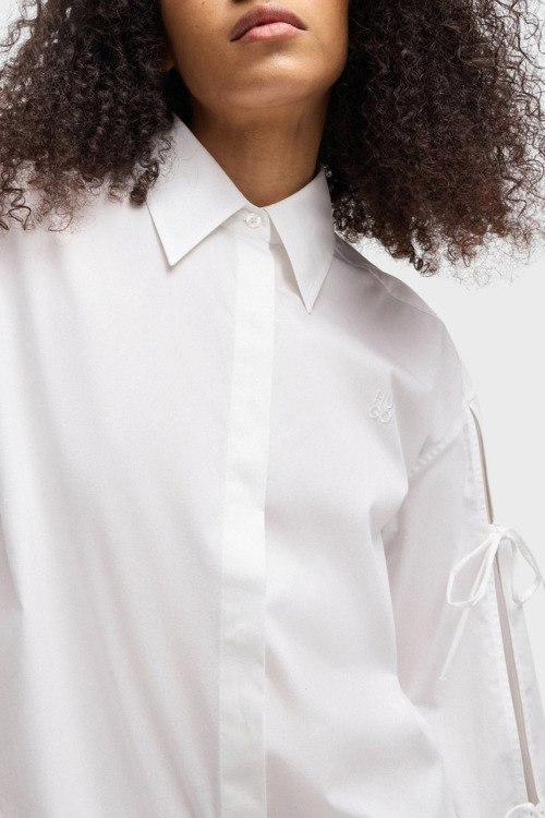 Детали: Женская белая рубашка Еvangelina из хлопка от Hugo by Hugo Boss (Хуго бай Хуго Босс). Классический воротник, застежка на пуговицы, длинные рукава с кулисками, фигурный низ изделия
