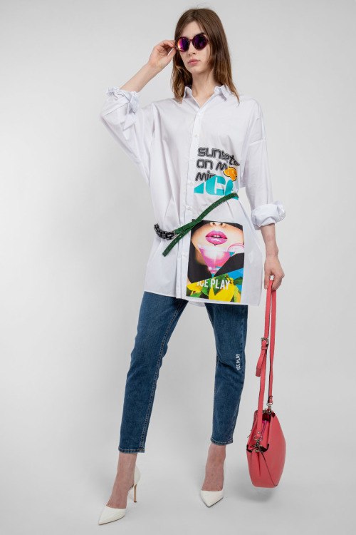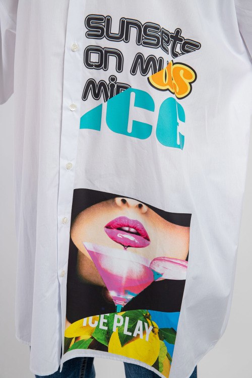 Женская белая рубашка из хлопка от Ice Play (Айс Плей). Удлиненная модель, классический воротник, застежка на пуговицы, приспущенная линия плеча, длинные рукава, манжеты на пуговице, декорирована ярким принтом.
