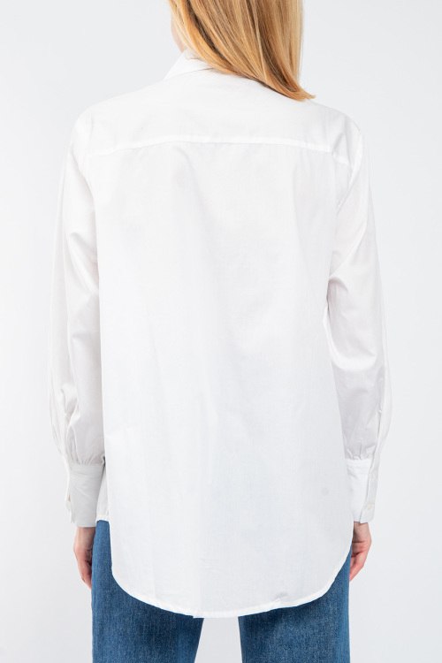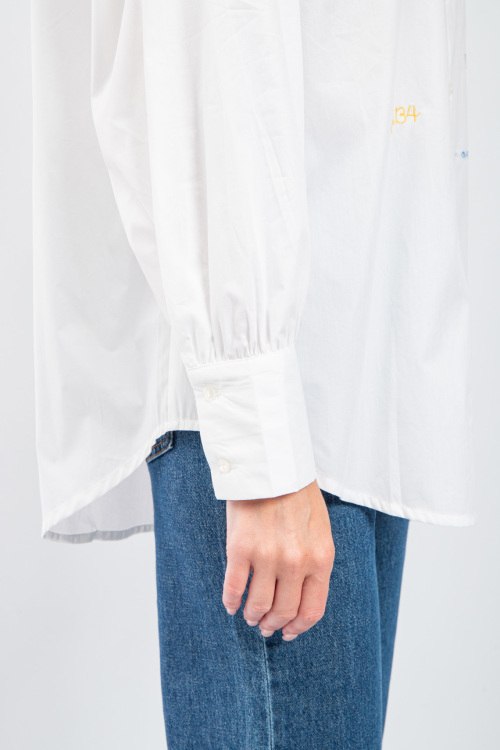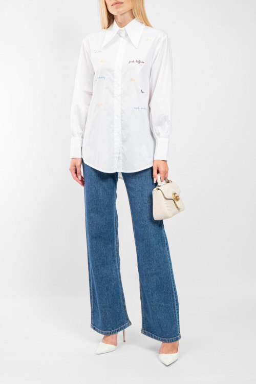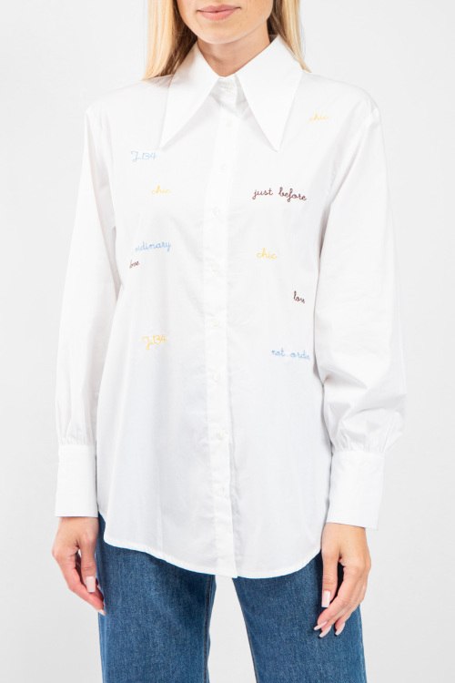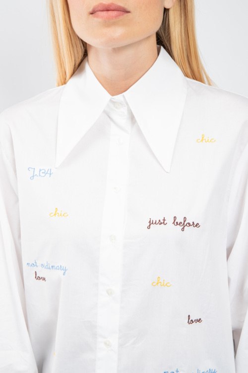 Женская белая хлопковая рубашка от J.B4 Just Before (Джаст Бифо). Разноцветная вышивка, отложной удлиненный воротник, застежка на пуговицы, манжеты на пуговицах, удлиненная длина.