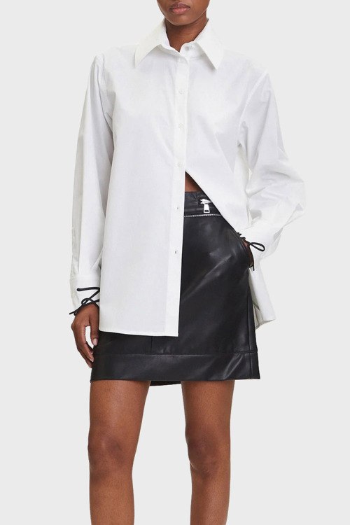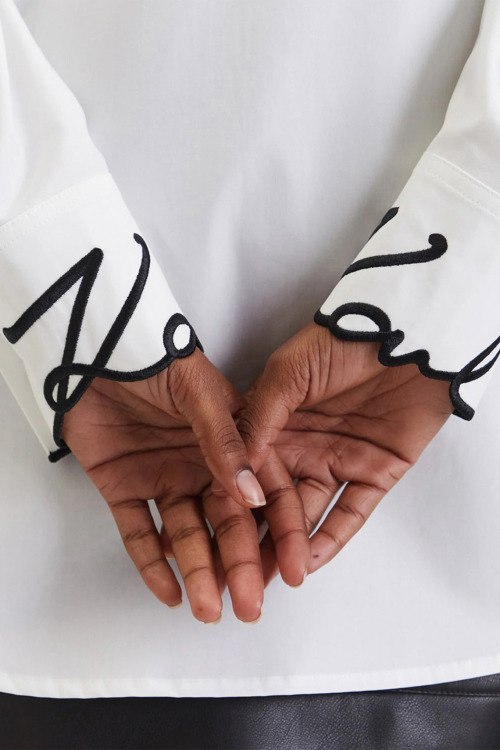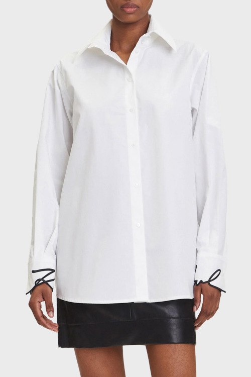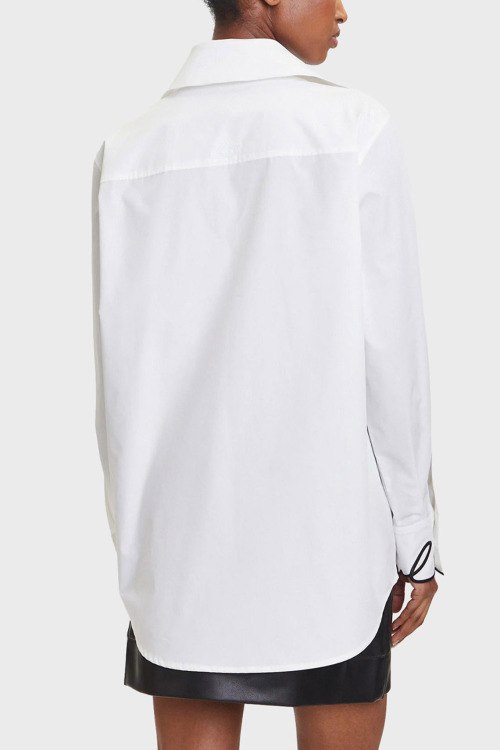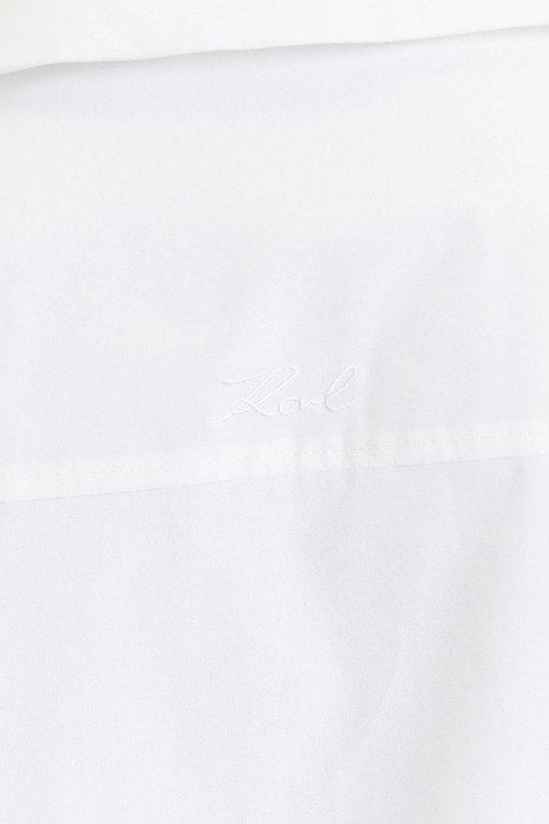 Детали: Женская белая хлопковая рубашка Signature от Karl Lagerfeld (Карл Лагерфельд). Отложной воротник, застежка на пуговицы, брендированные манжеты, удлиненная длина