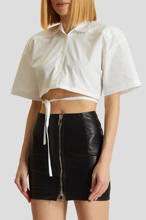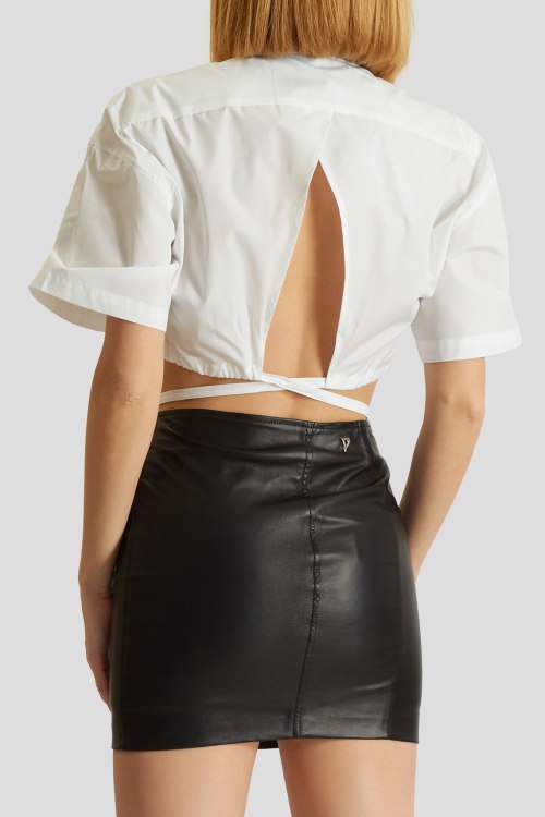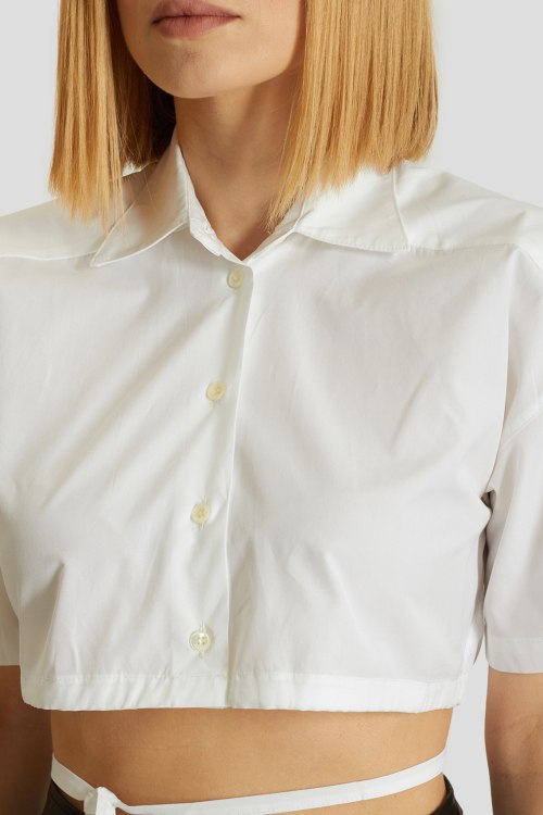Женская белая хлопковая рубашка от Laneus (Ланеус). Отложной воротник, разрез на спине, застежка на пуговцы, короткий рукав, укороченная длина, завязки.
