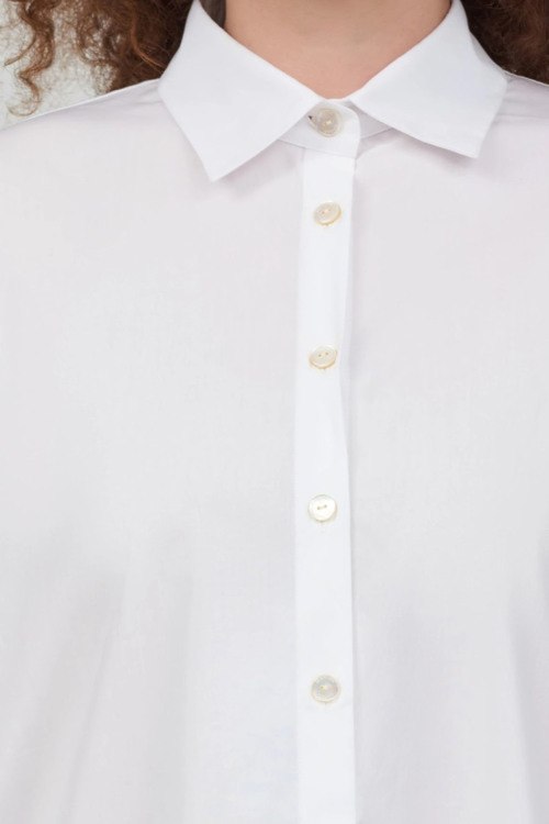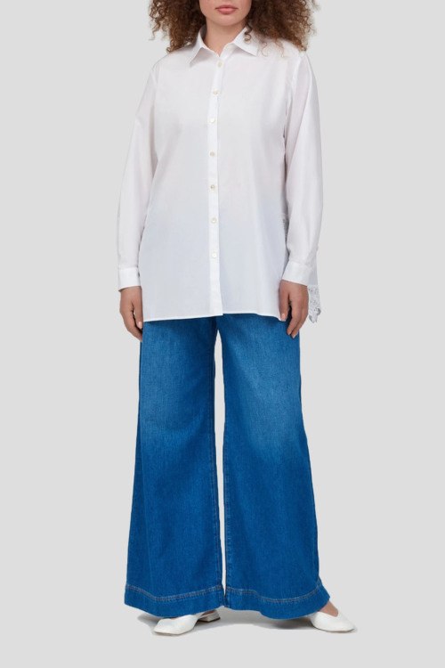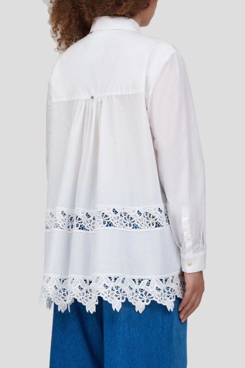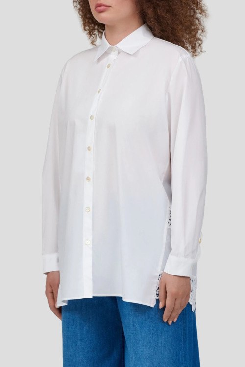 Детали: Женская белая рубашка из хлопка от Marina Rinaldi (Марина Ринальди). Классический воротник, застежка на пуговциы, длинные рукава, кружевные вставки